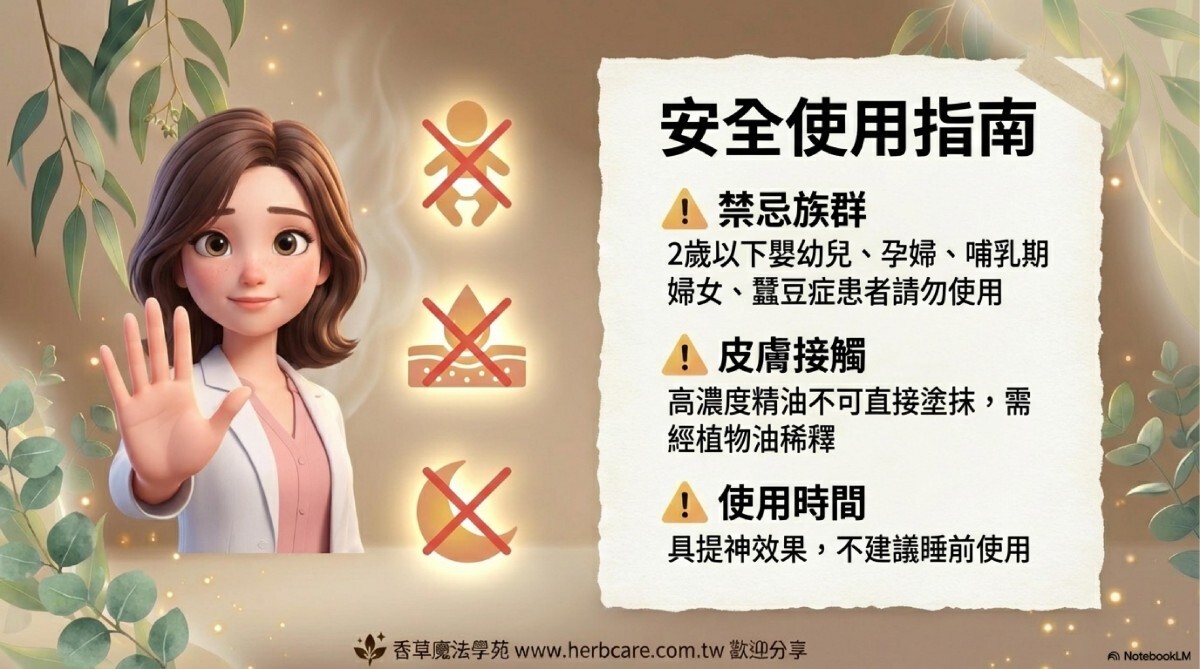 | A2: 尤加利精油的1,8-桉油醇成分較強烈,可能對孕婦和嬰幼兒的呼吸道造成負擔。建議2歲以下嬰幼兒、孕婦與哺乳期婦女都應避免使用。 |