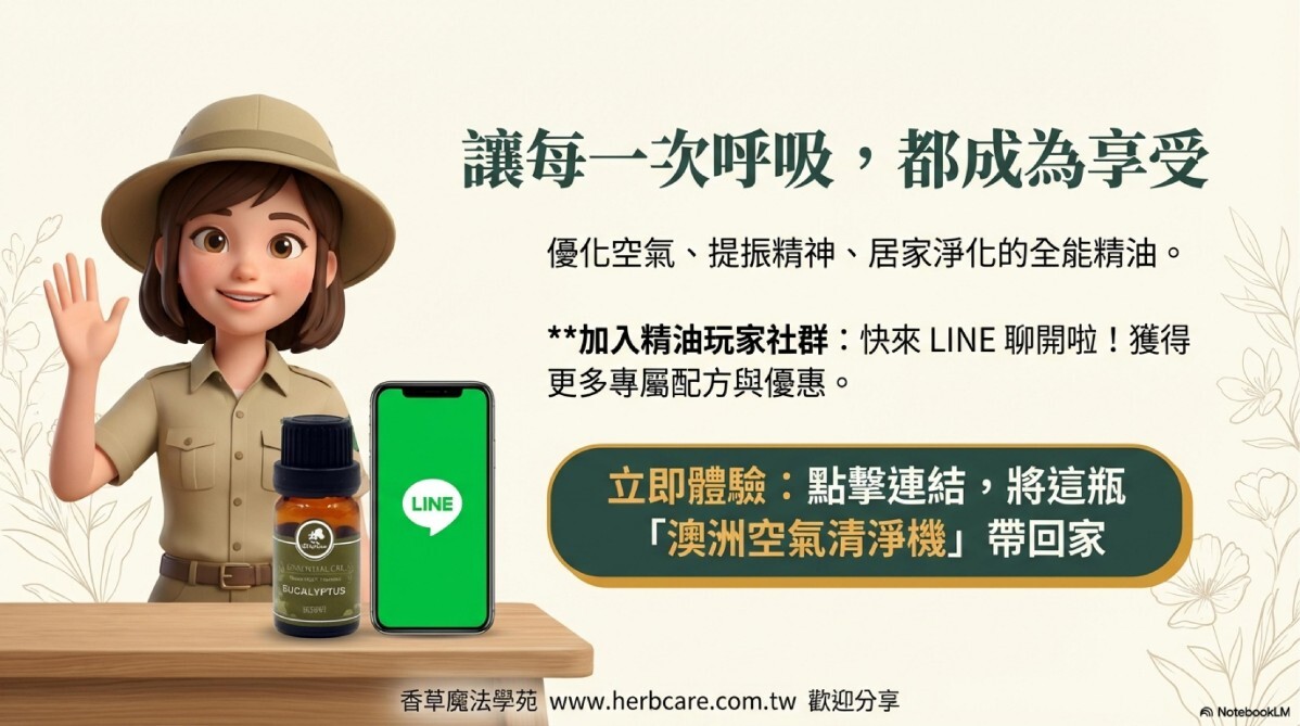 當你感到呼吸不暢、鼻塞困擾,或想為居家環境進行空氣淨化時,你是否總覺得少了點什麼?尤加利精油,這款來自澳洲的「空氣清淨機」,以其穿透性十足的清新香氣,成為你最信賴的呼吸道守護者。它的清涼香氣,彷彿能瞬間打開你的呼吸道,為你帶來前所未有的暢快感。從澳洲原住民數百年的傳統應用,到現代芳療的廣泛使用,尤加利精油的淨化與提振功效有目共睹。無論是想維持呼吸順暢、提神醒腦,或是想為潮濕、悶熱的空間帶來清爽的氣息,尤加利精油都能發揮其卓越的作用。它不只是一款精油,更是一種清澈、純粹的生活態度。讓尤加利的清新能量,為你的身心帶來前所未有的輕盈與暢快。