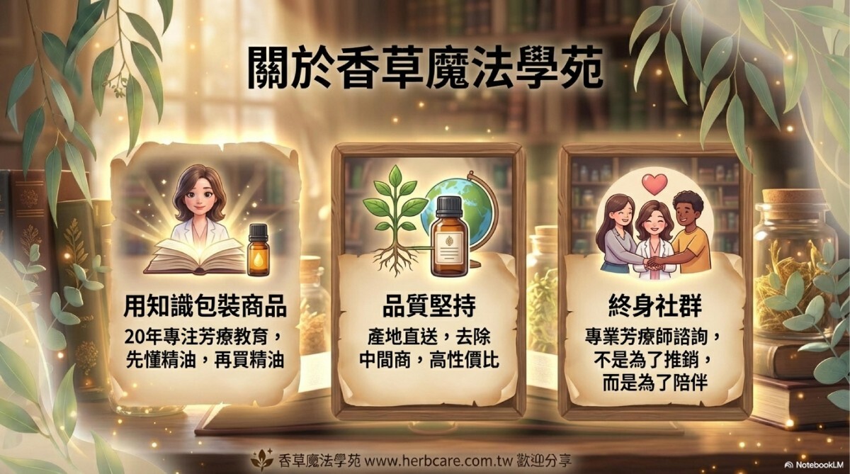 創立於20多年前,香草魔法學苑不只是個精油網站,更是由一群熱愛精油的同好共同打造的學習社群。我們相信,精油不只是商品,而是能優化身心靈的美好工具。因此,我們致力於「用知識包裝商品」,讓你先了解精油,再找到最適合你的選擇。