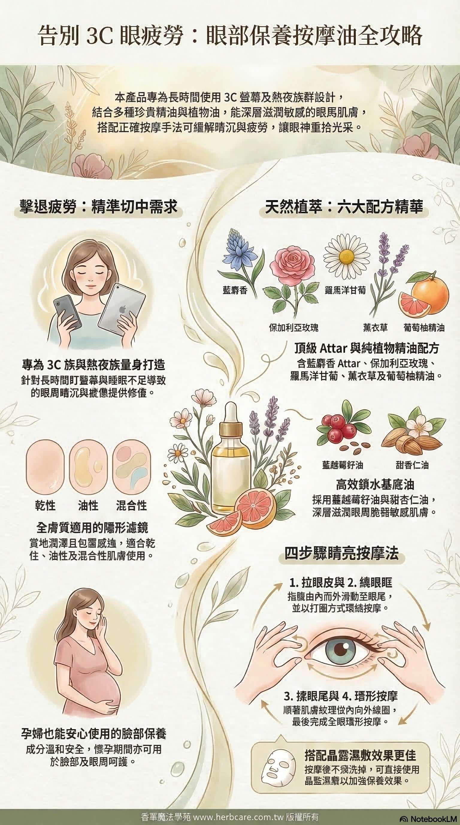 熬夜追劇?長時間盯3C屏幕?別讓眼周洩漏年齡秘密!專為靈魂之窗量身打造眼部保養按摩油,蘊含蔓越莓籽油與甜杏仁油的潤澤包覆,加上藍麝香Attar精油、羅馬洋甘菊、保加利亞玫瑰及薰衣草的溫柔呵護,輕撫你的眼周疲憊。輕輕按摩,像給眼周穿上一層隱形濾鏡,告別暗沉與疲憊,無論昨晚睡多久,今天都像睡滿了十小時!