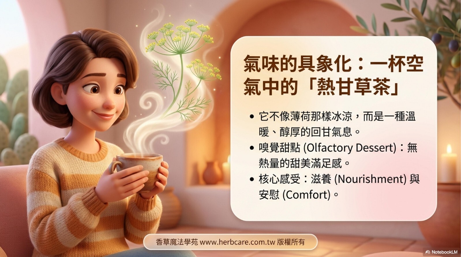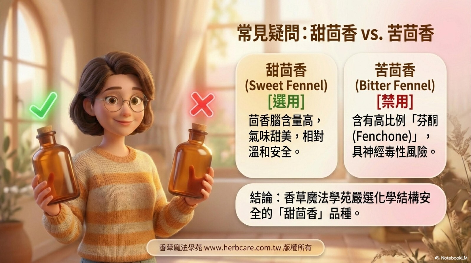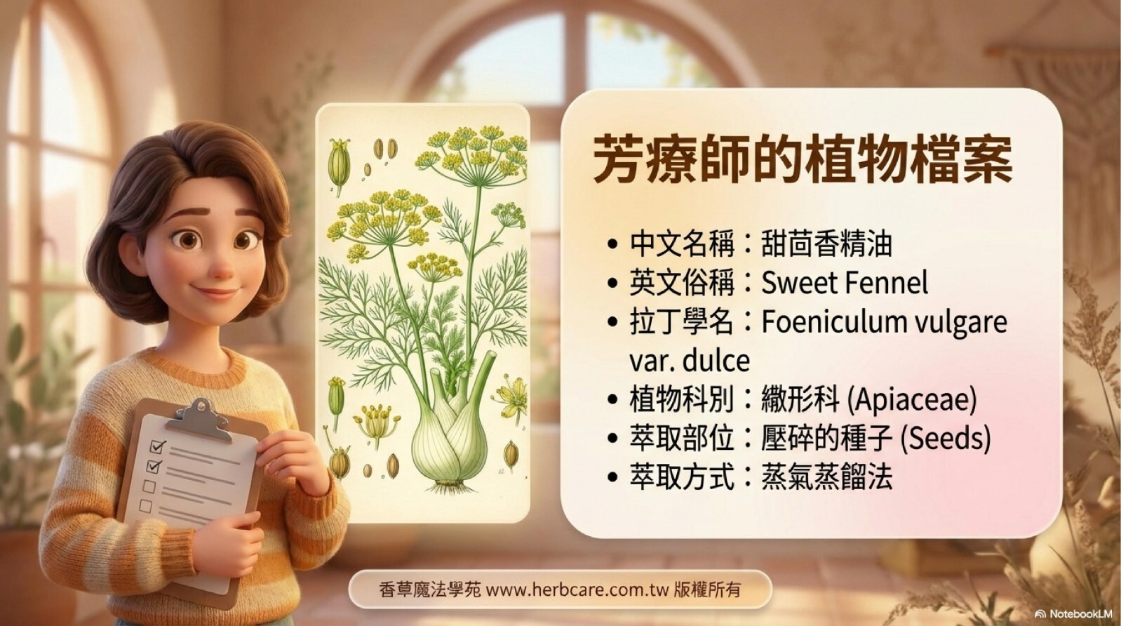 甜茴香是大自然賜予女性與消化系統的溫柔良藥。 香草魔法學苑嚴選化學結構安全的「甜茴香」品種, 並提供專業的禁忌說明,讓您在安心的環境下,享受這份來自香料植物的甜美療癒。