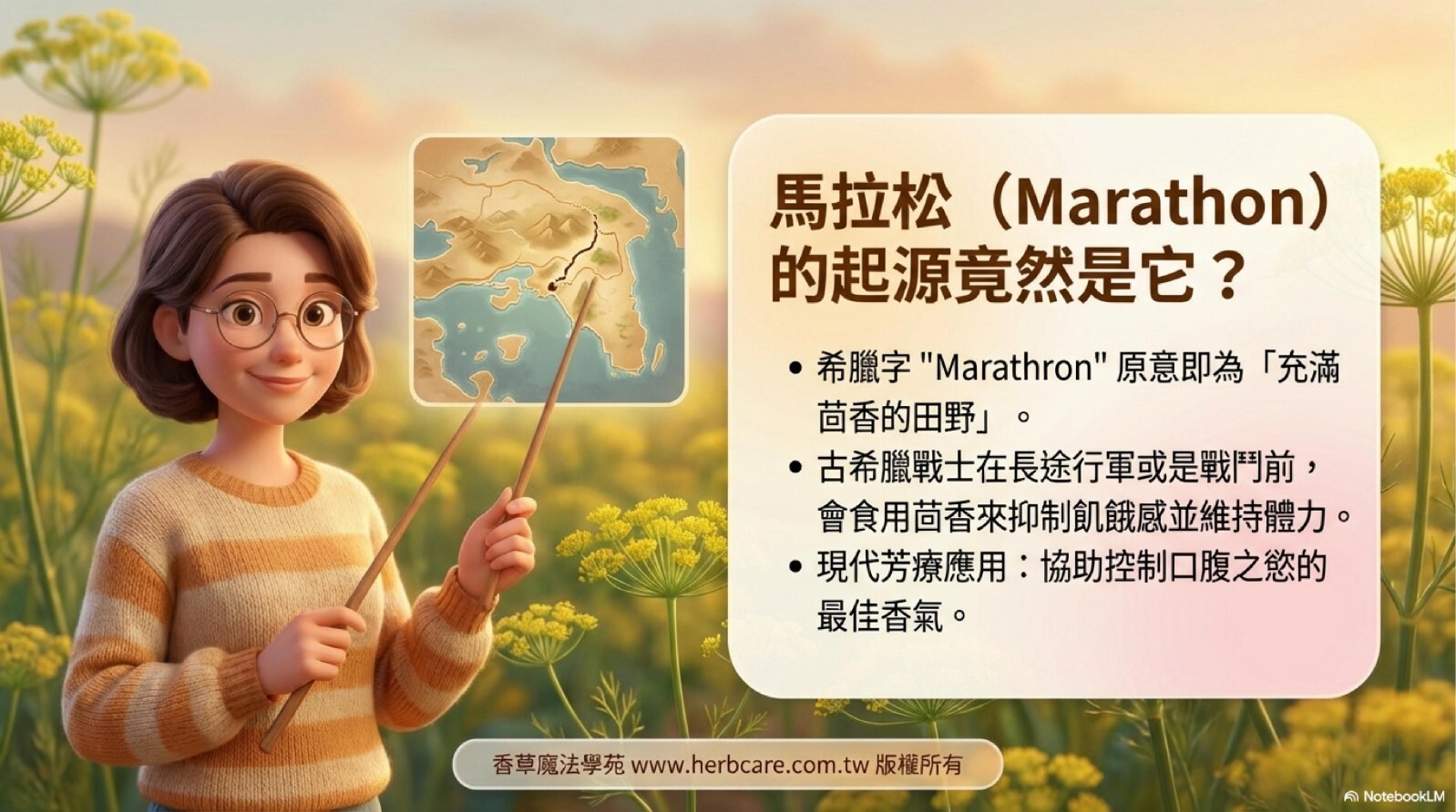 希臘字「Marathon(馬拉松)」其實源自 Marathron,意思是「充滿茴香的田野」。古希臘戰士在長途行軍或戰鬥前會食用茴香來抑制飢餓感並維持體力。這也呼應了現代芳療中,將茴香用於「抑制口腹之慾」的應用。