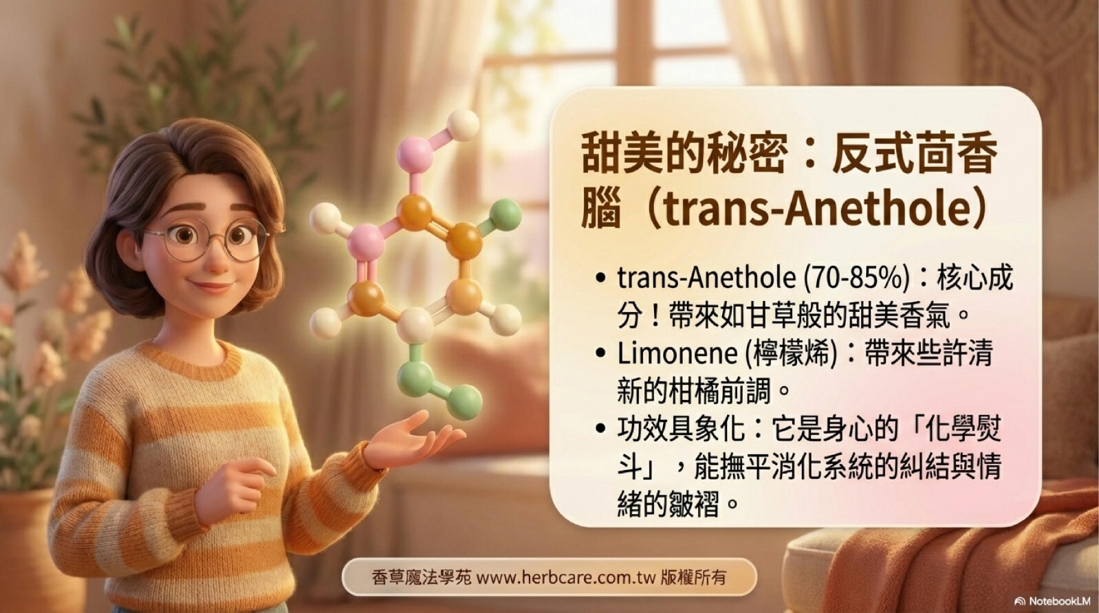 甜茴香的靈魂在於「醚類」結構,這賦予了它強大的特性。