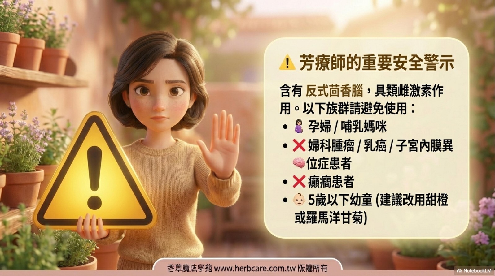 甜茴香含有反式茴香腦 (trans-Anethole),具有類雌激素作用,請務必遵守以下禁忌: