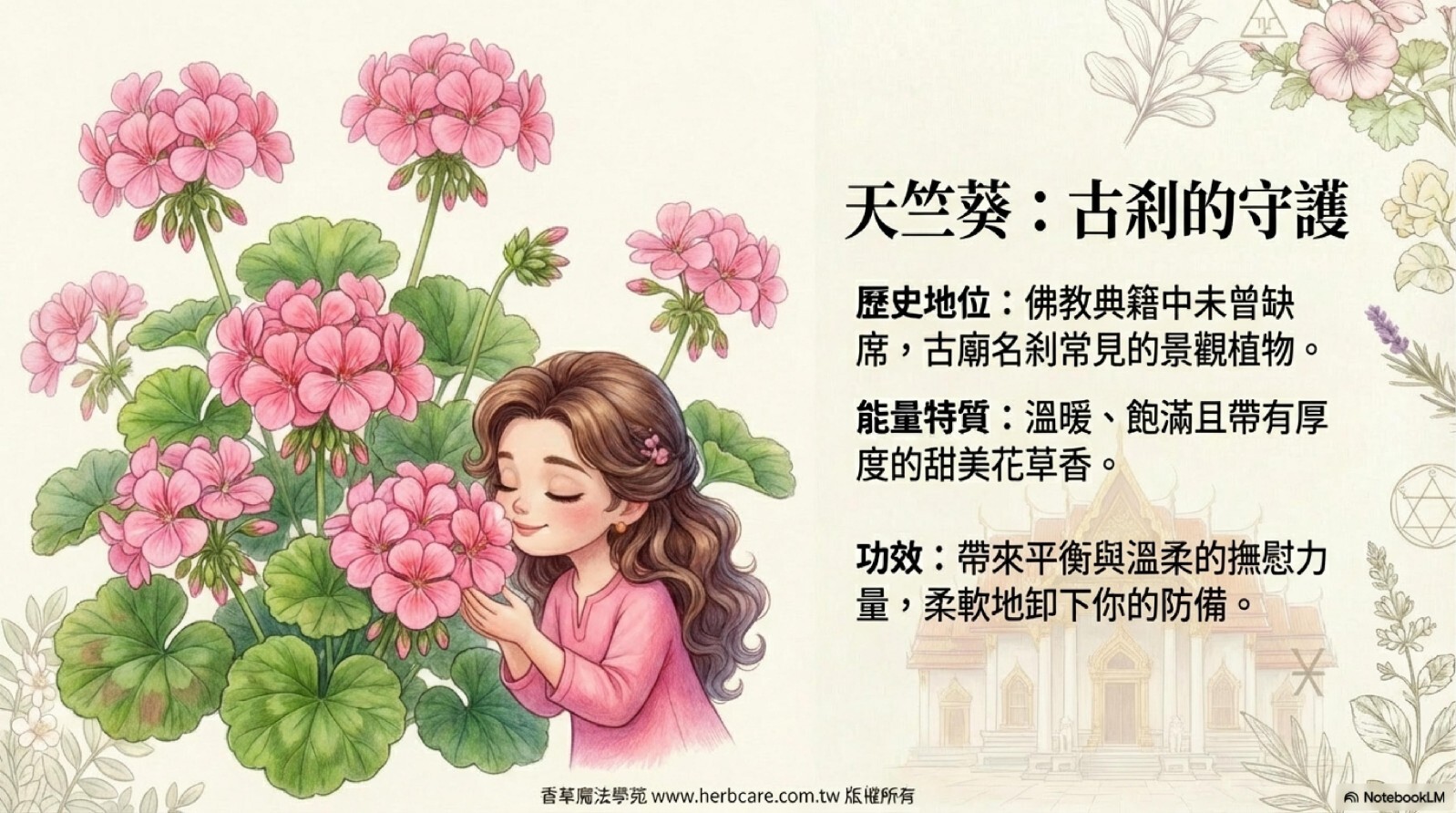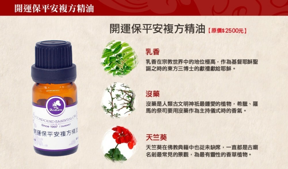 天竺葵在佛教典籍中也從未缺席,一直都是古廟名剎最常見的景觀,為最有靈性的香草植物。開運保平安的精油配方,就該具備如此靈性根源,最崇高的誠意才能有最好的功德緣分。