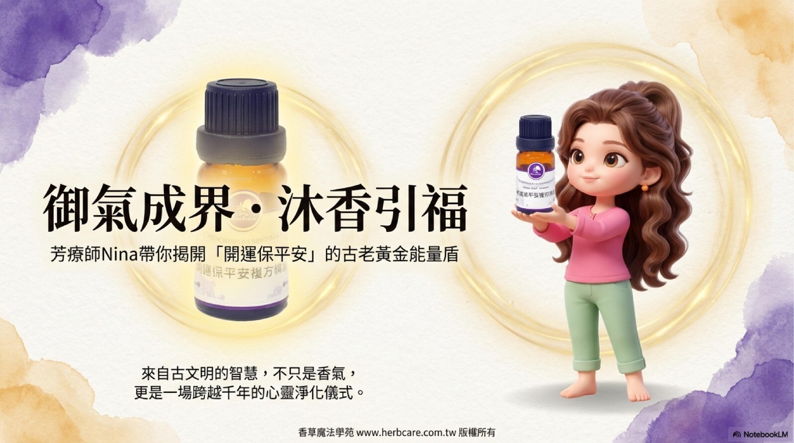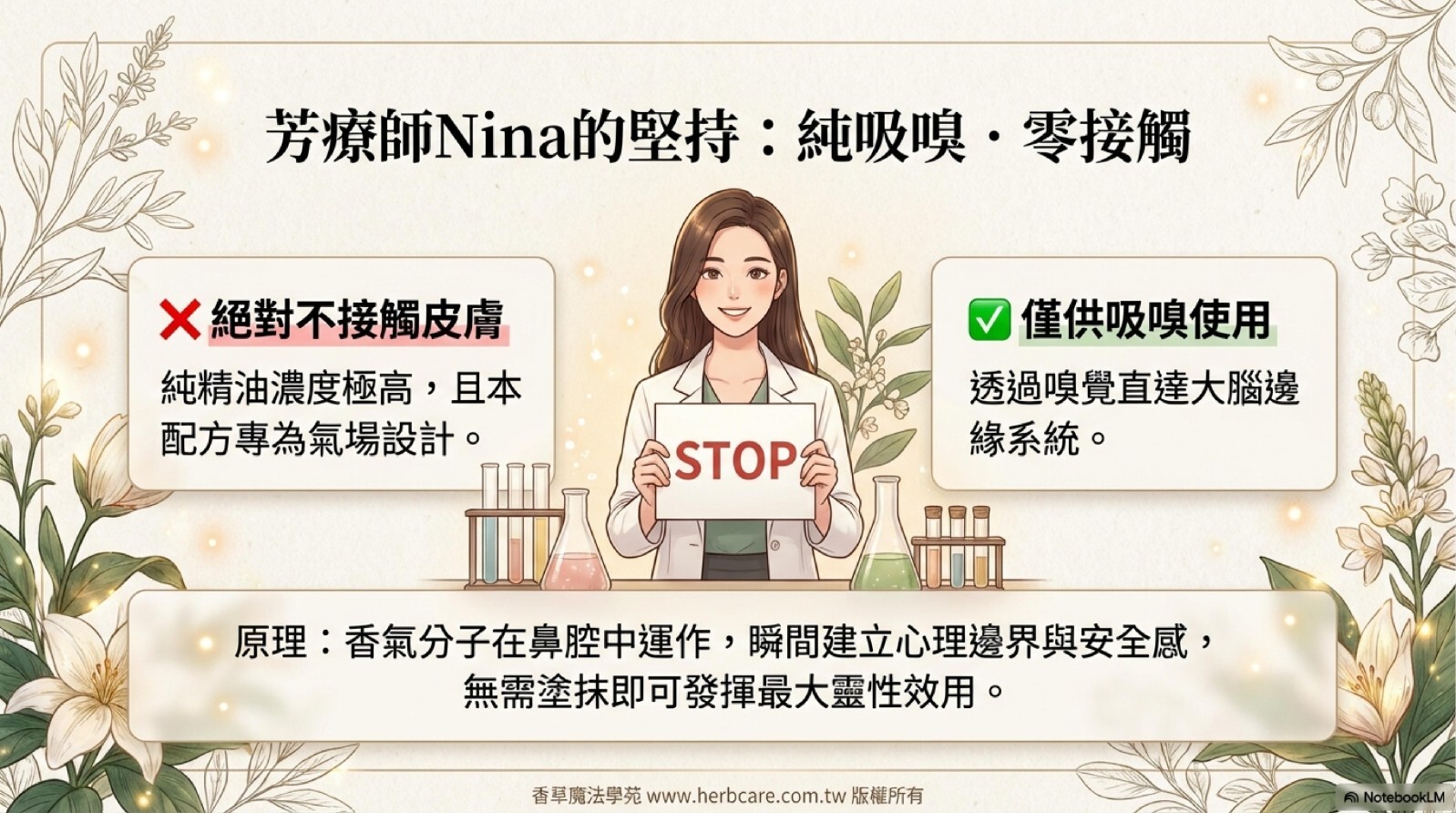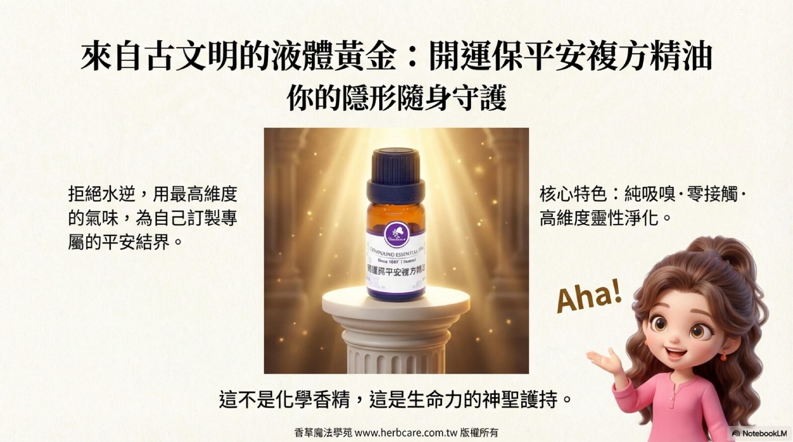本精油配方為百分之百純植物提煉,絕無化學香精或其他雜質成分,同時奉勸使用者注意,避開來路不明或化學成分的東西,以免怠慢靈性,適得其反。