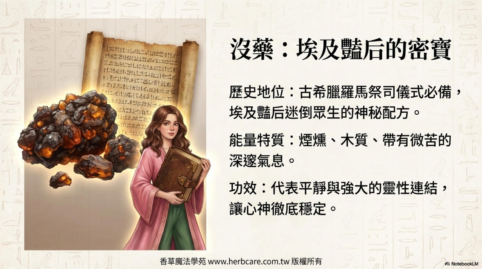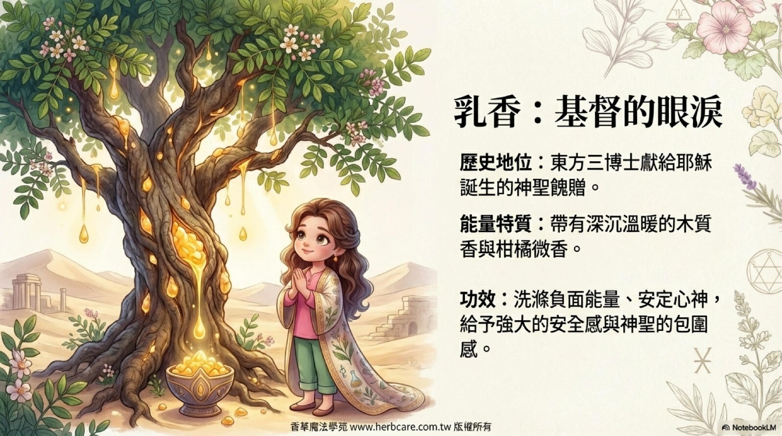 乳香在宗教世界中的地位極高,作為基督耶穌聖誕之時的東方三博士的獻禮獻給耶穌,(另外兩個饋禮是沒藥跟黃金),沒藥同時也是人類古文明神祇最鍾愛的植物,希臘、羅馬的祭司要用沒藥作為主持儀式時的香氣,埃及豔后迷倒凱撒大帝的神秘配方也是沒藥,乳香跟沒藥自古就是歐美文明與宗教中最尊榮的寶物。