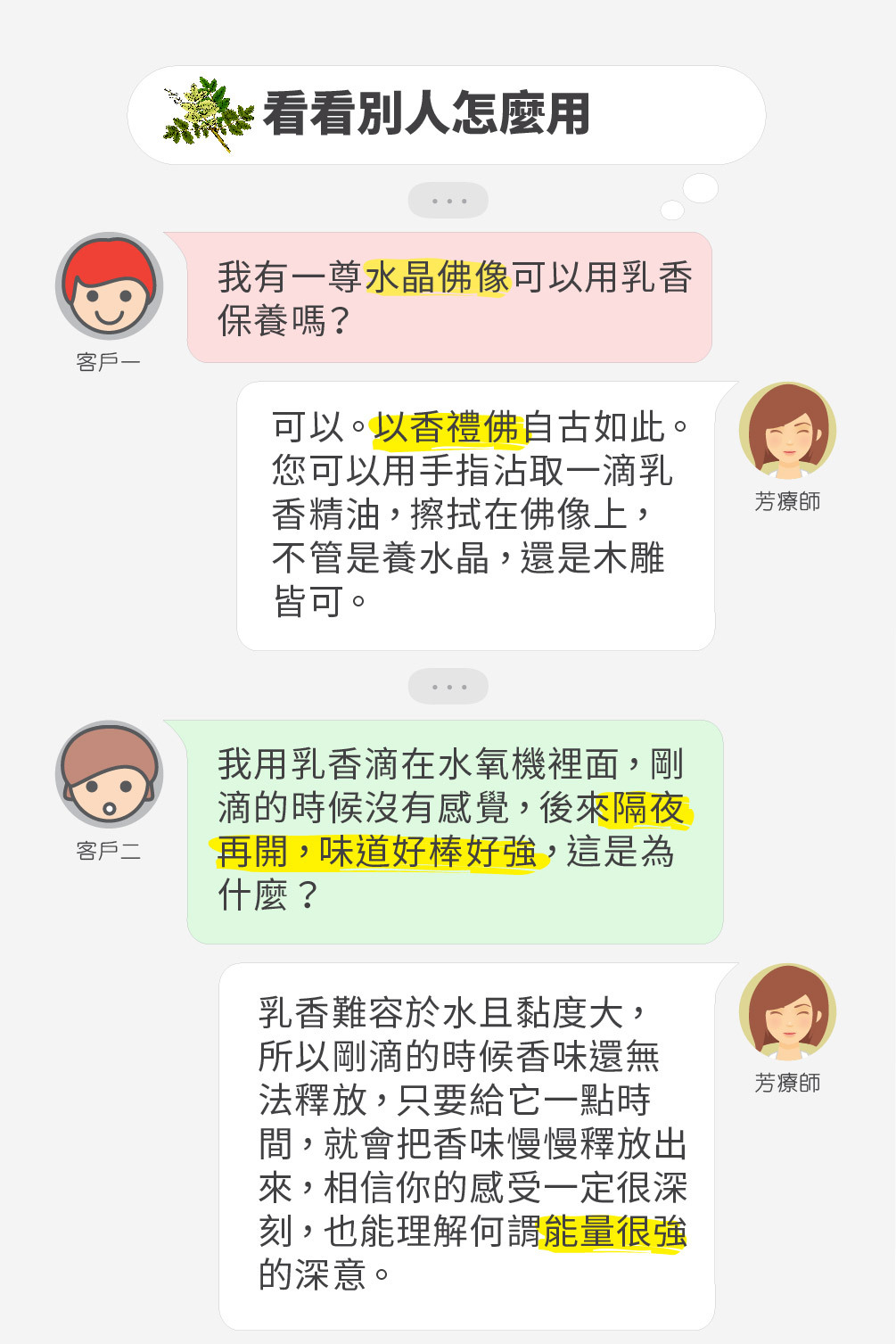 | A1: 不建議直接塗抹純精油。雖然乳香精油相對溫和,但仍建議先諮詢專家。 |