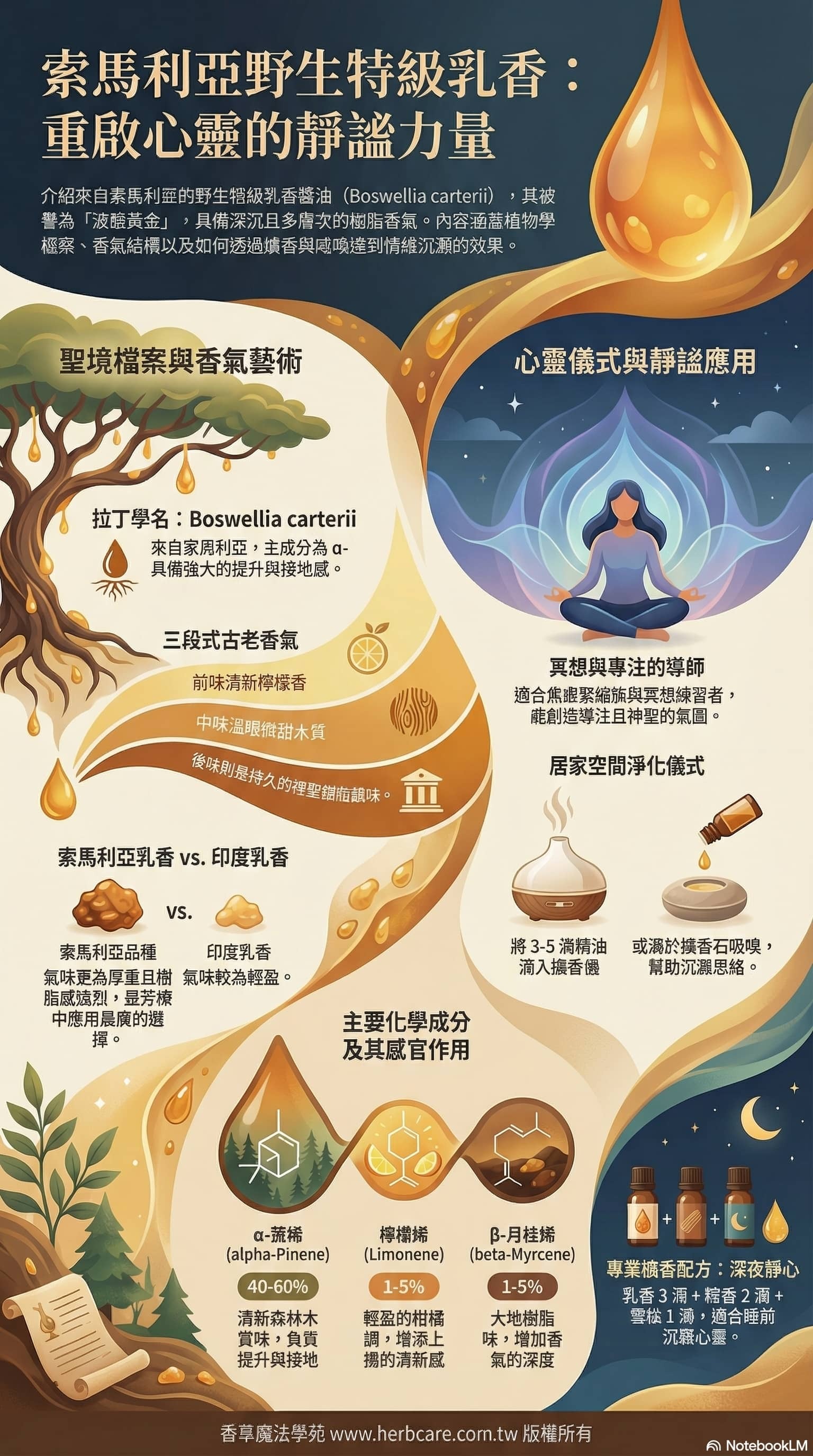 | 種類/品種差異 | 乳香精油因產地不同而有多個品種,常見的有索馬利亞乳香 (Boswellia carterii) 和印度乳香 (Boswellia serrata)。此處介紹的索馬利亞乳香,其氣味更為厚重、樹脂感強烈,是芳療中應用最廣泛的種類。 |