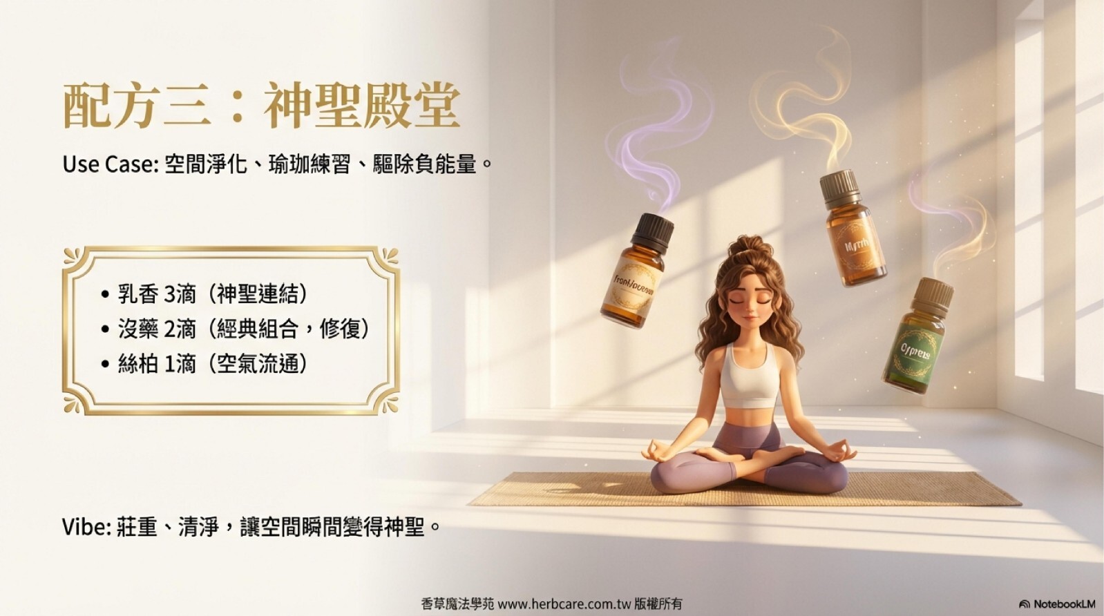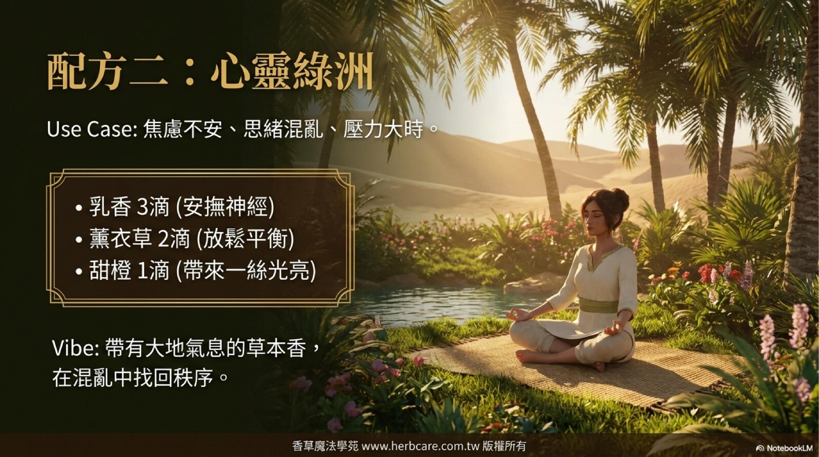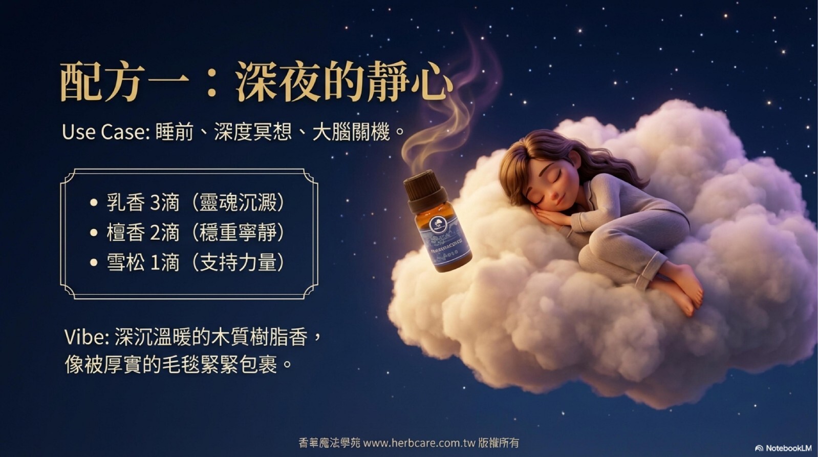 需求/時間點:當你感到焦慮、心神不寧時;或是想在睡前、冥想前,為自己創造一個寧靜的空間。