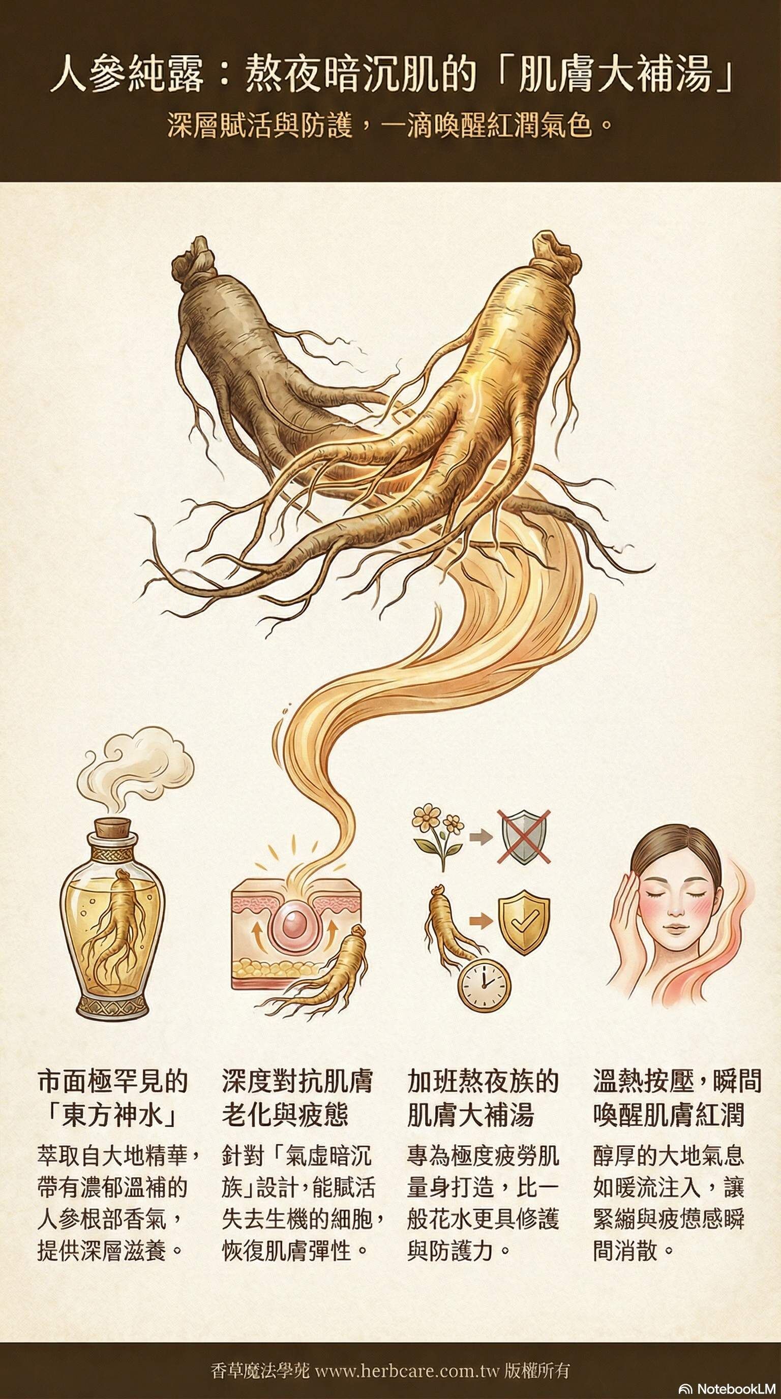人參純露,是蒸餾人參精油時所產生的人參水,本品無額外添加,含有微量的人參精油,人參被譽為「百草之王」,含有其他植物中所沒有的特殊成分「人蔘皂甙」,對保護和修復肌膚有特別的效用,滋養活顏,能夠為疲憊的肌膚注入活力,增加皮膚營養供應,更是一種對抗時間的秘密武器!難怪韓國女生化妝桌上都有至少一瓶人參護膚品,今天開始保養第一道程序就從人參純露開始打通美肌任督二脈!