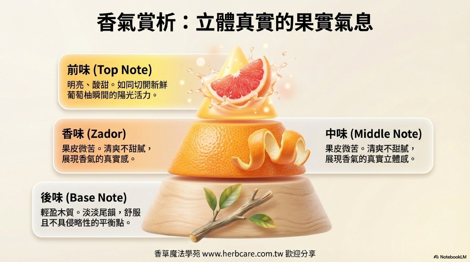 | A1: 葡萄柚精油的香氣帶有天然的酸甜感,但整體是清新愉悅的果實香,不會像直接吃到果肉那樣酸澀。 |