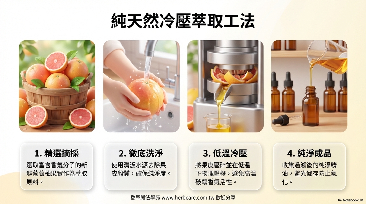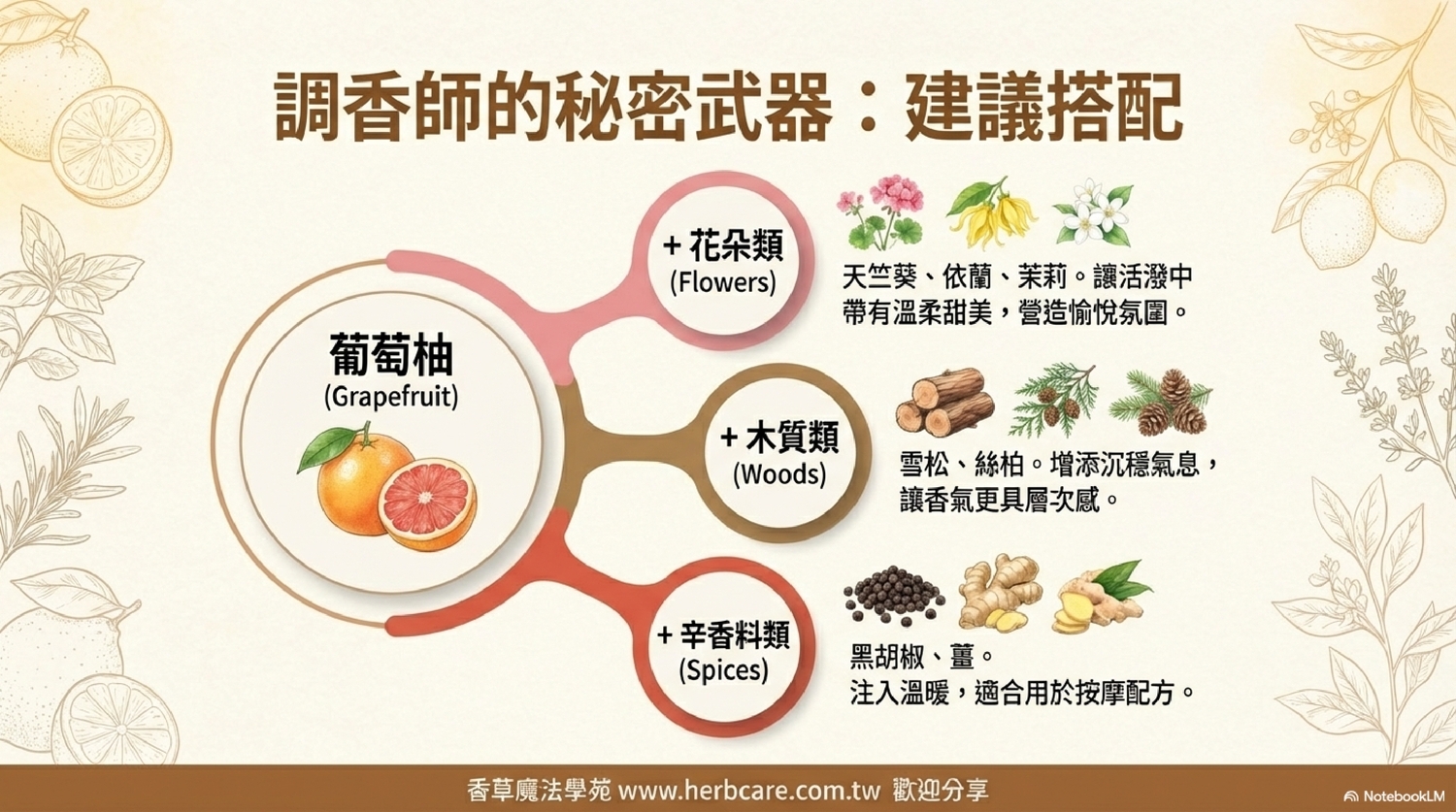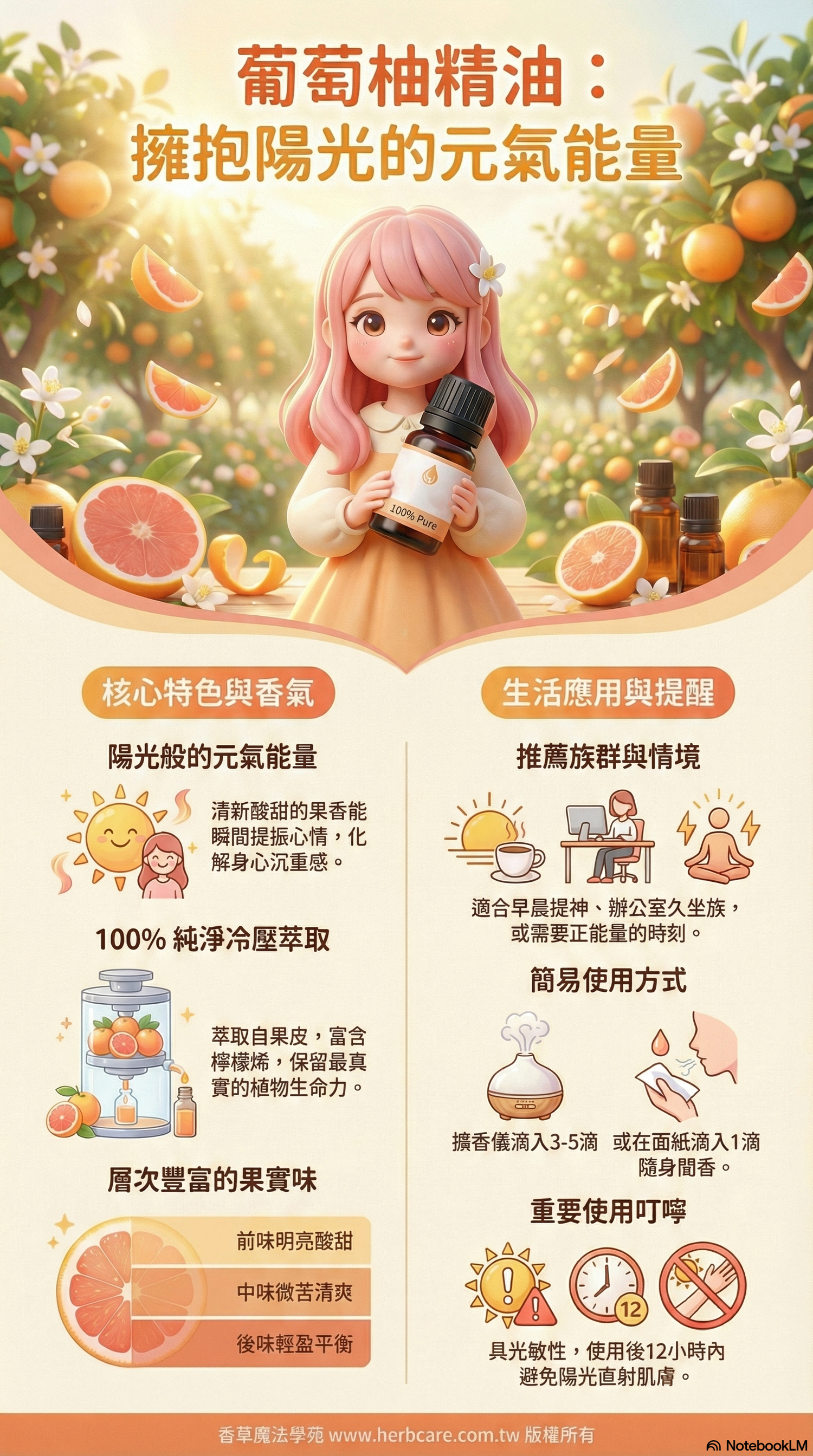 | 種類/品種差異 | 葡萄柚精油主要可分為白葡萄柚和紅葡萄柚。白葡萄柚精油帶有較多果皮的微苦澀感,而紅葡萄柚精油則更加甜美。兩者在芳療應用上並無太大差異,可依據個人喜好選擇。 |