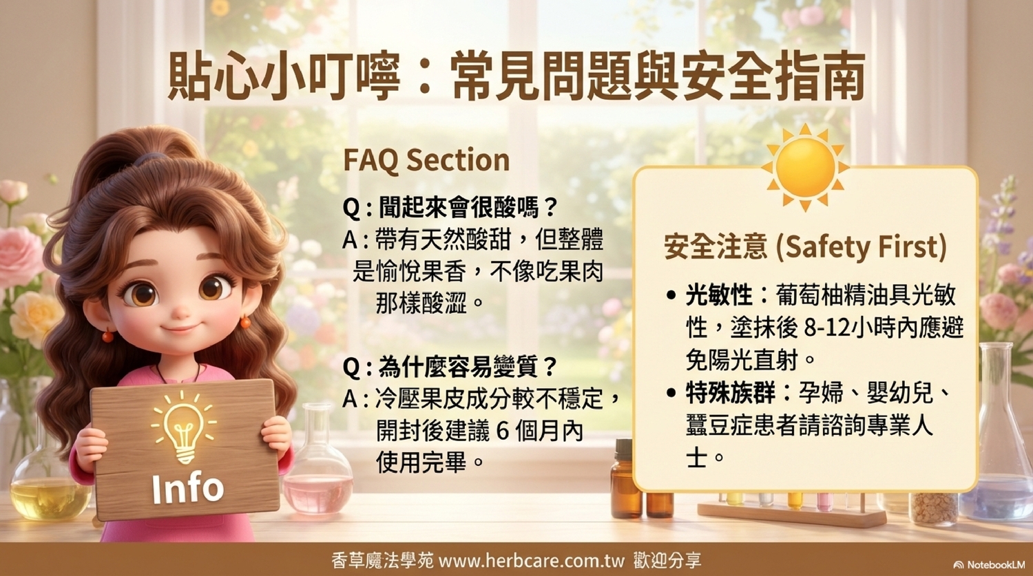 | A5: 葡萄柚精油確實具有光敏性。若將其塗抹於肌膚後,8-12小時內應避免陽光直射,以免引起色素沉澱或肌膚不適。 |