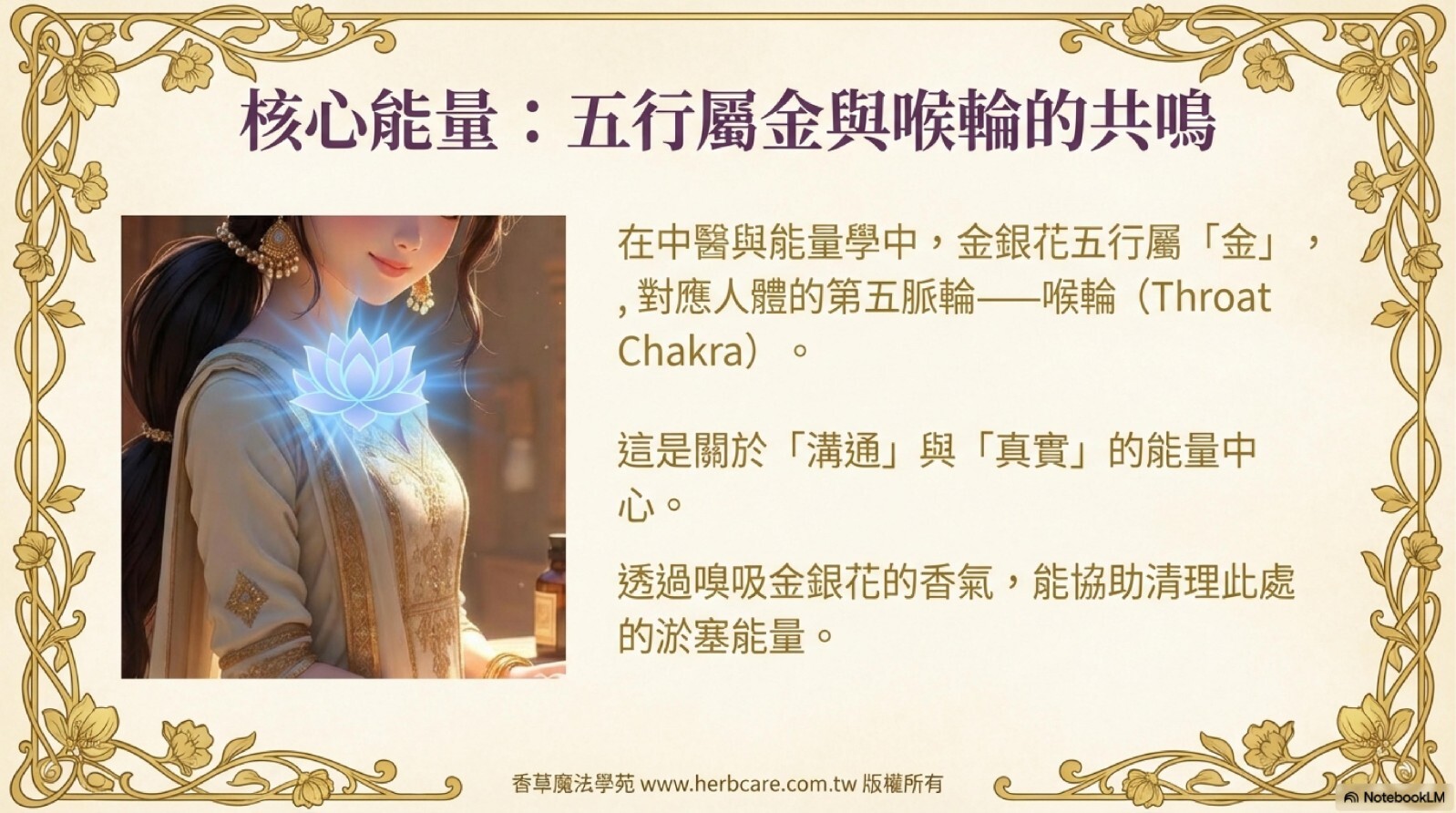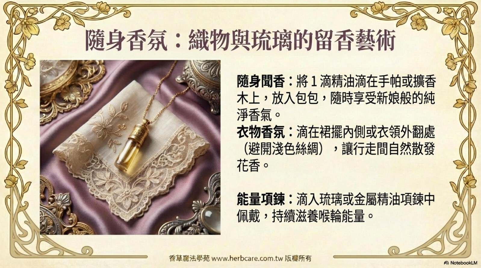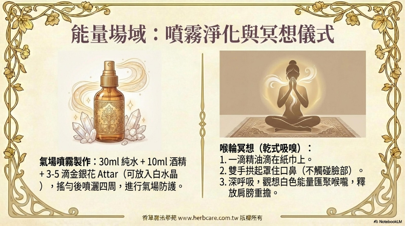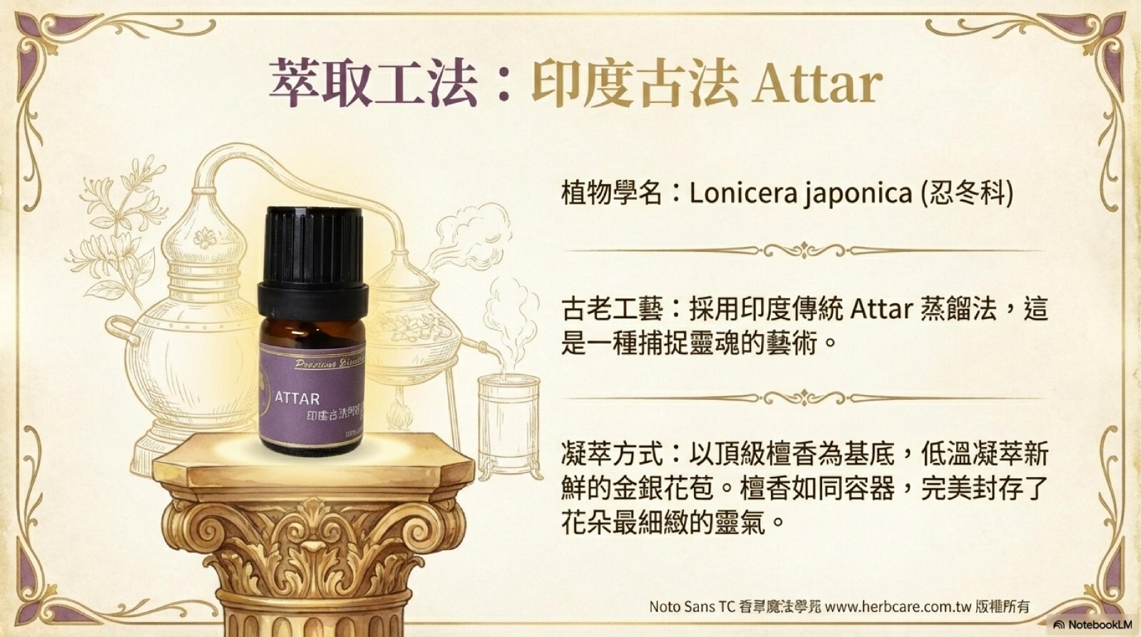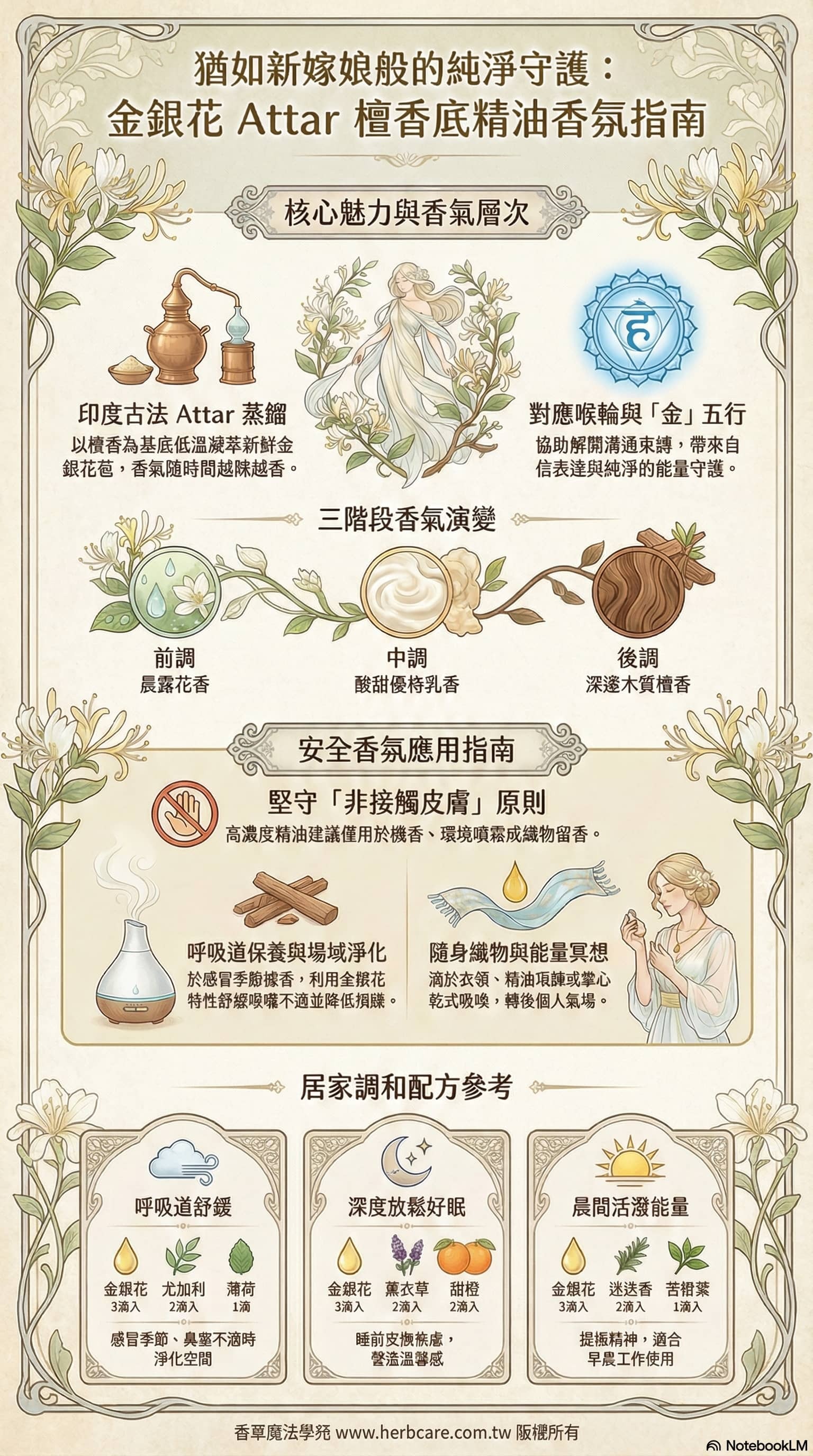 源自印度千年Attar蒸餾工藝,以忍冬花苞低溫凝萃,完整保留芳樟醇、金合歡醇等珍貴成分。獨特「新娘香調」由清甜奶香漸變至微苦木質,如晨妝新娘般優雅純淨,適合打造個人香域與肌膚保養,五行屬金特性更能強化氣場防護。