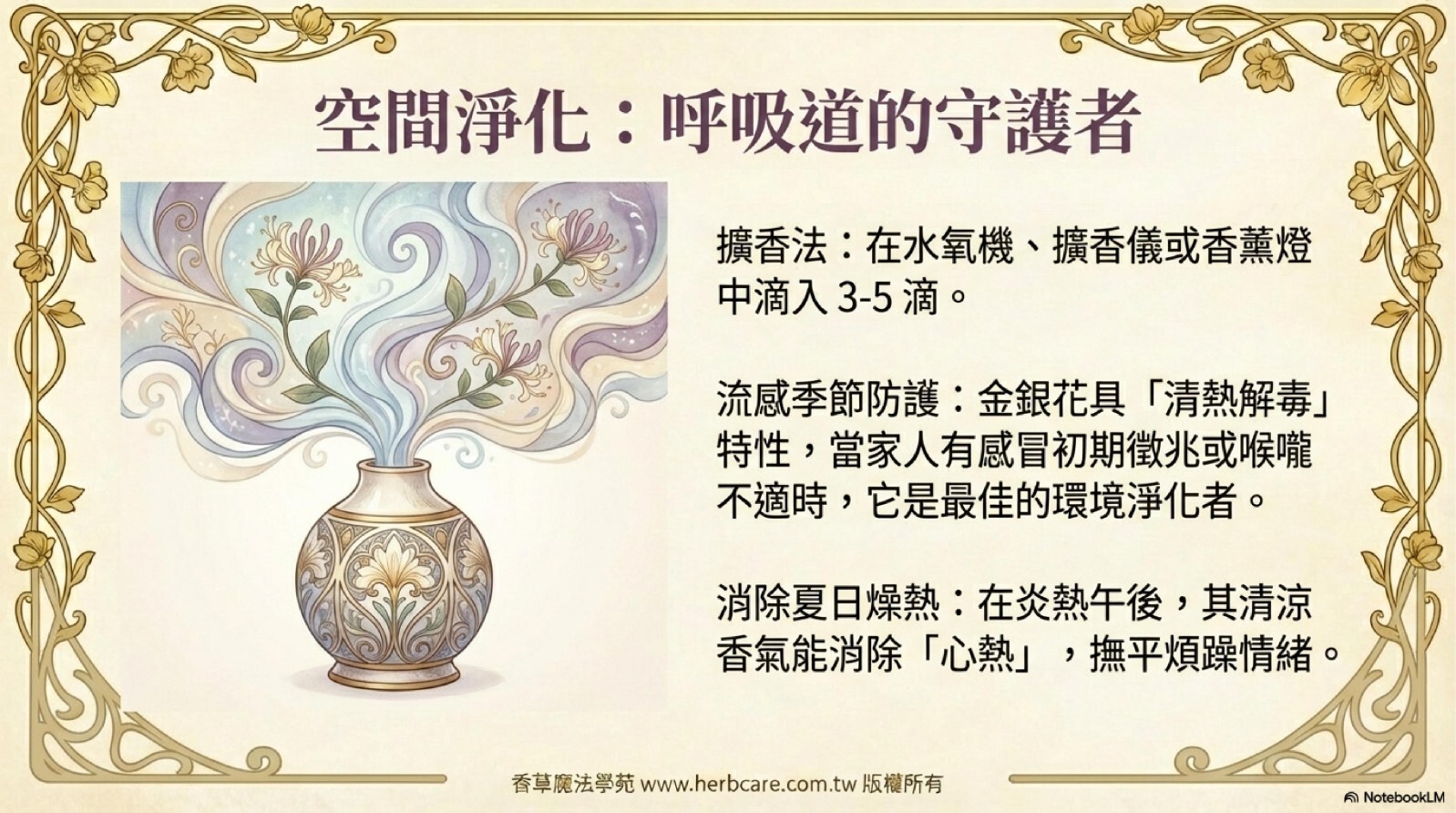 | 隨心所欲 | 金銀花Attar精油3d+薄荷精油2d+尤加利精油2d+薰衣草精油2d+印度百合精油2d | 空氣品質優化 |