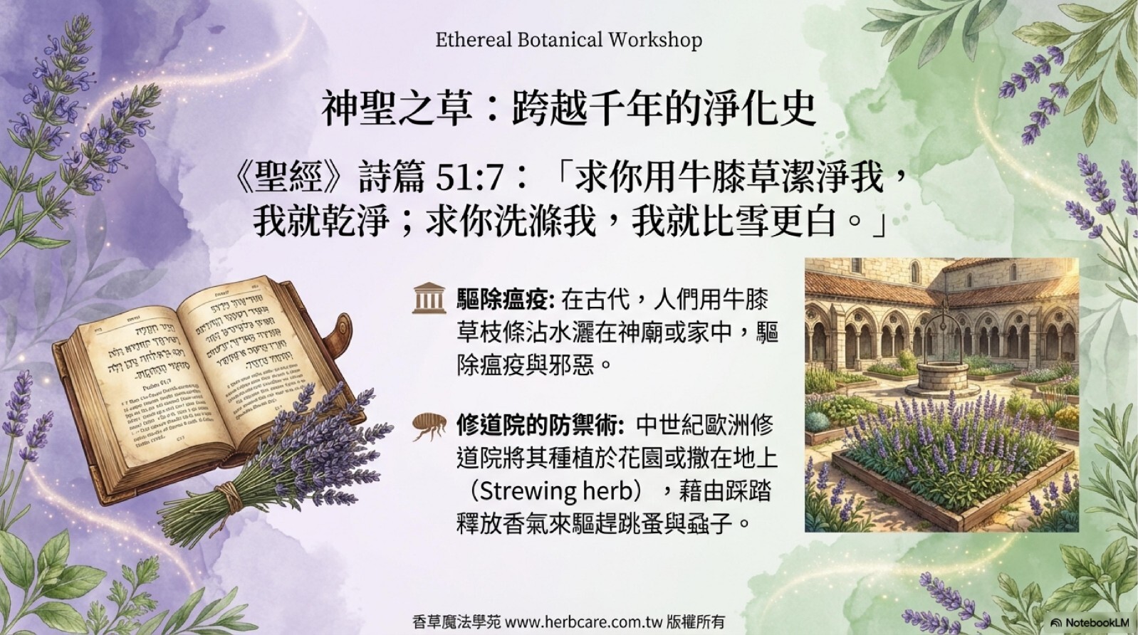 《聖經》詩篇 51:7 寫道:「求你用牛膝草潔淨我,我就乾淨;求你洗滌我,我就比雪更白。」在古代,人們會用牛膝草枝條沾水灑在神廟或家中,用來驅除瘟疫與邪惡。直到今日,它仍是芳療中處理「空間淨化」與「負面能量」的首選。