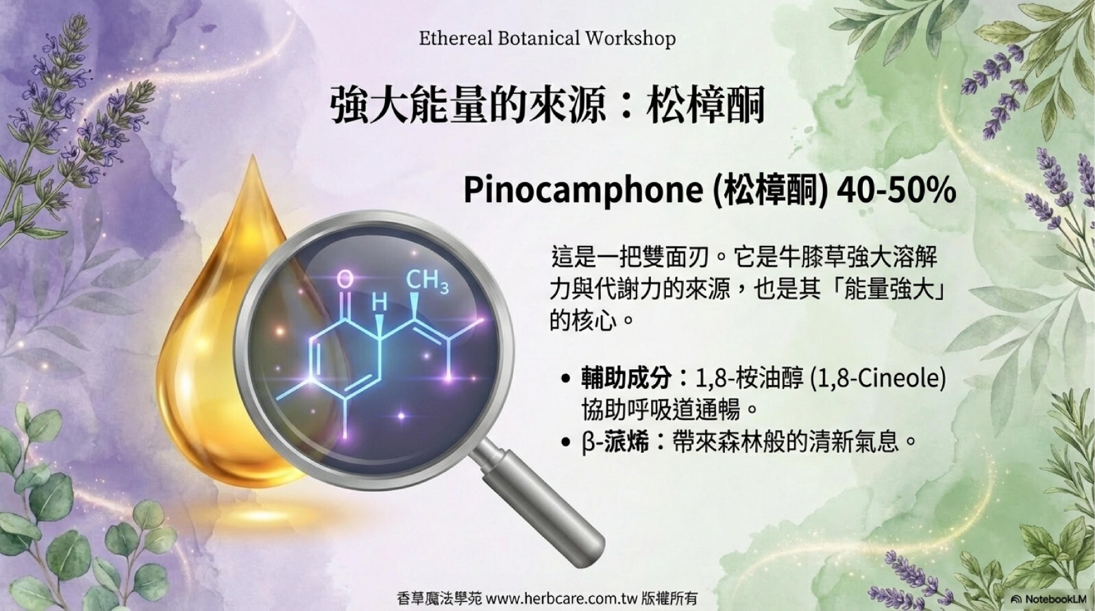 | Pinocamphone (松樟酮) & Iso-pinocamphone | 30-50% (依產地而異) | 關鍵成分! 具有極強的淨化能力。但此成分具神經毒性,這也是為何癲癇患者與孕婦禁用的主因。 |