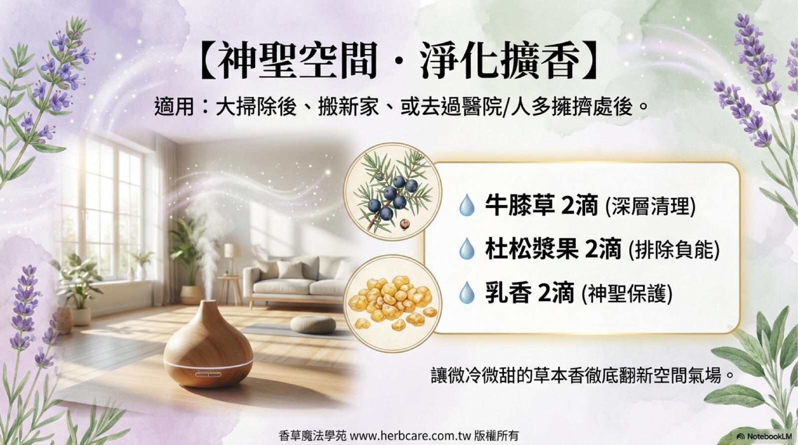 👉 用法: 在大掃除後、或搬新家、去過醫院後擴香,讓空間能量煥然一新。