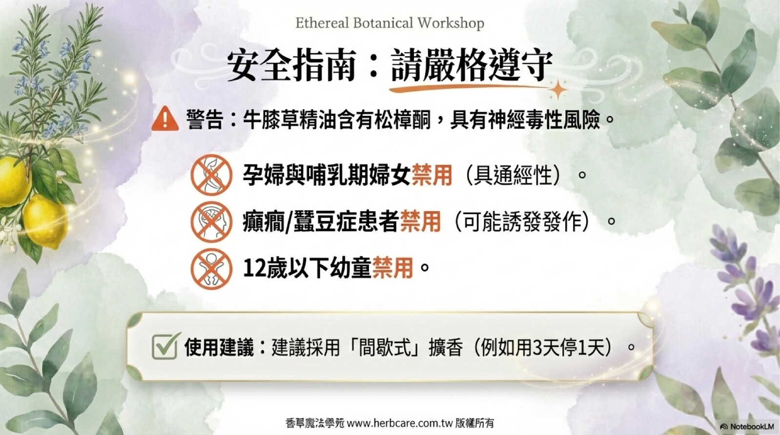 牛膝草精油含有松樟酮(Pinocamphone),雖然療效強大,但具有神經毒性風險。請務必嚴格遵守以下禁忌: