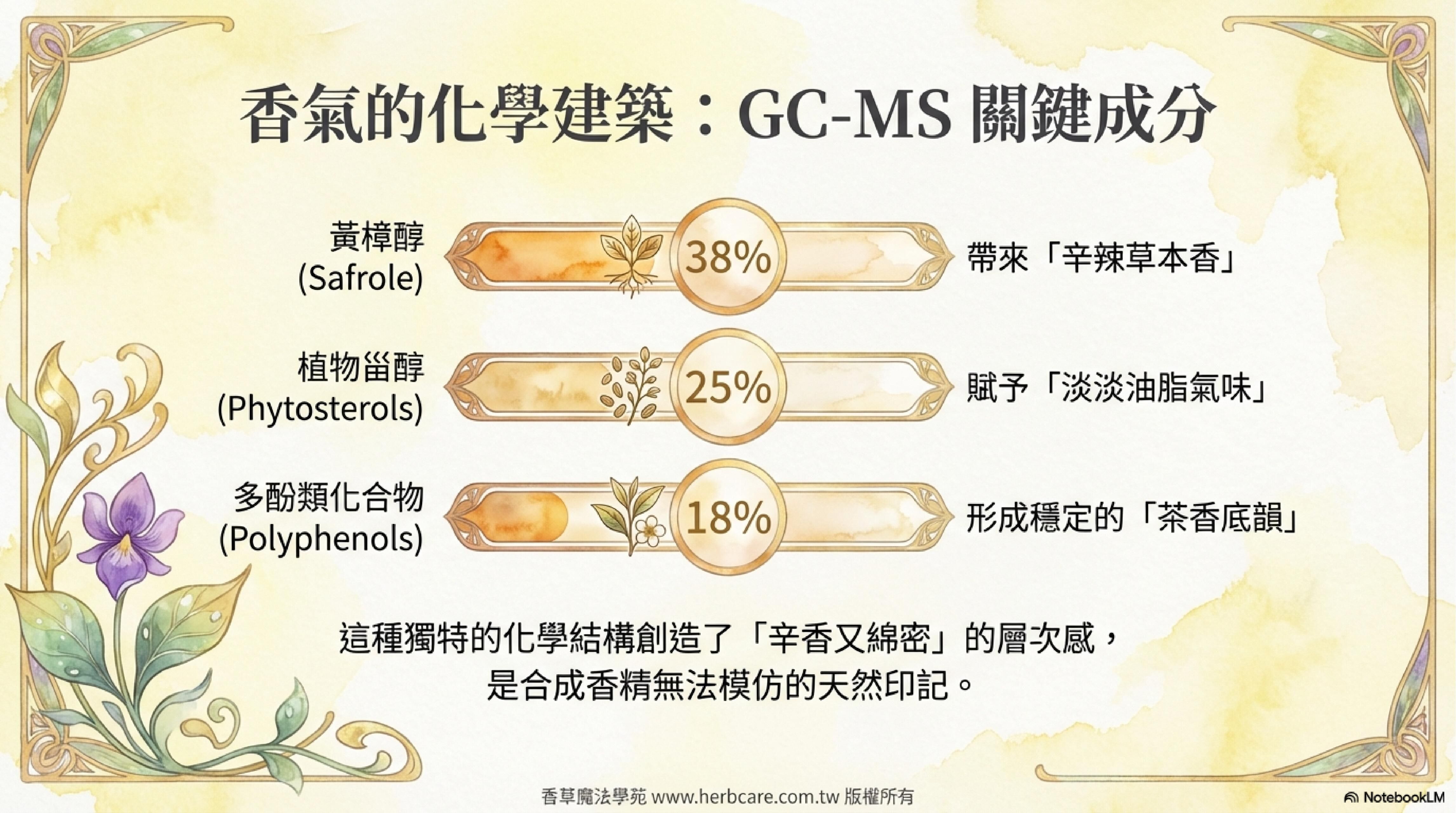 | 黃樟醇 | 38% | 辛辣草本香 |