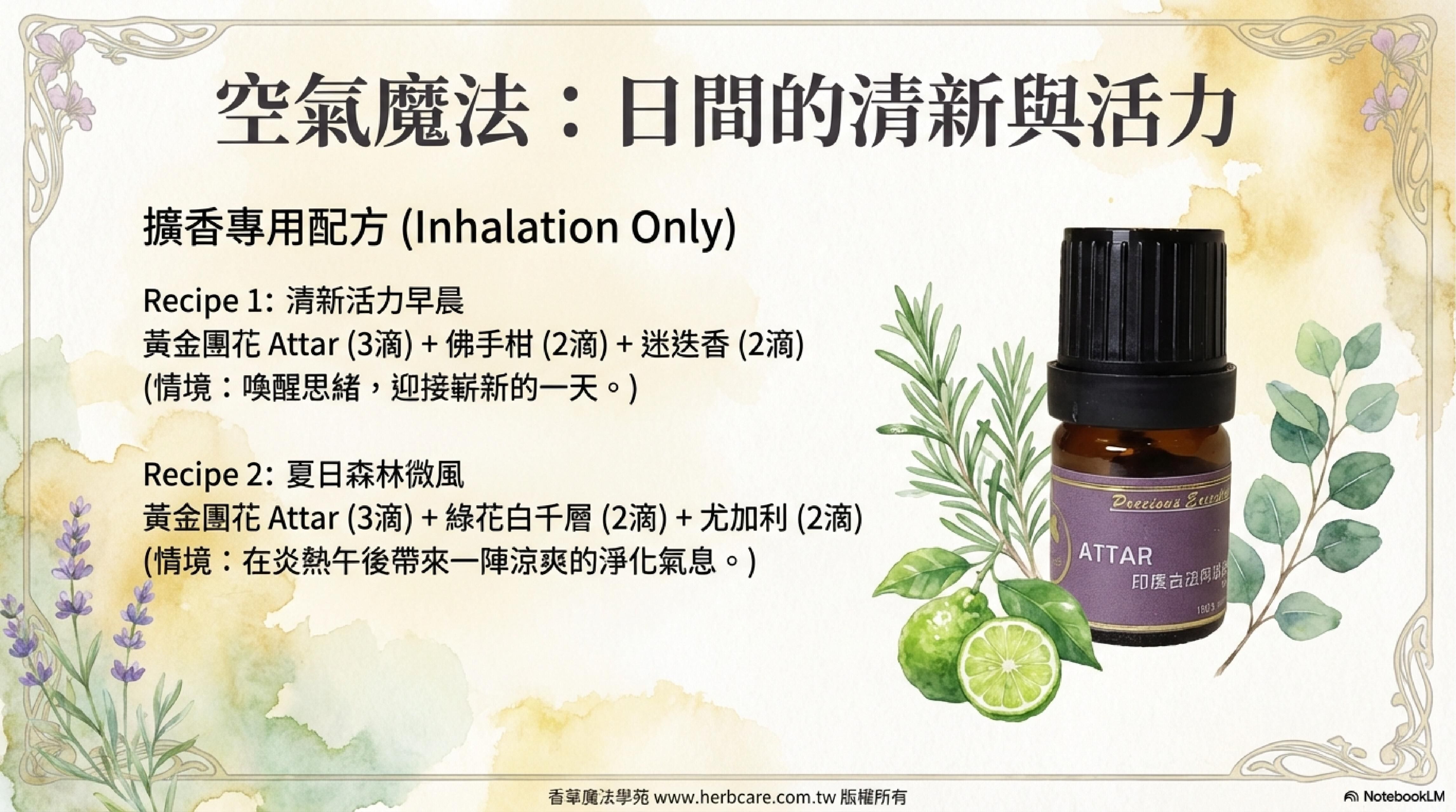 | 清新活力早晨 | 黃金團花Attar精油3d+佛手柑精油2d+迷迭香精油2d |