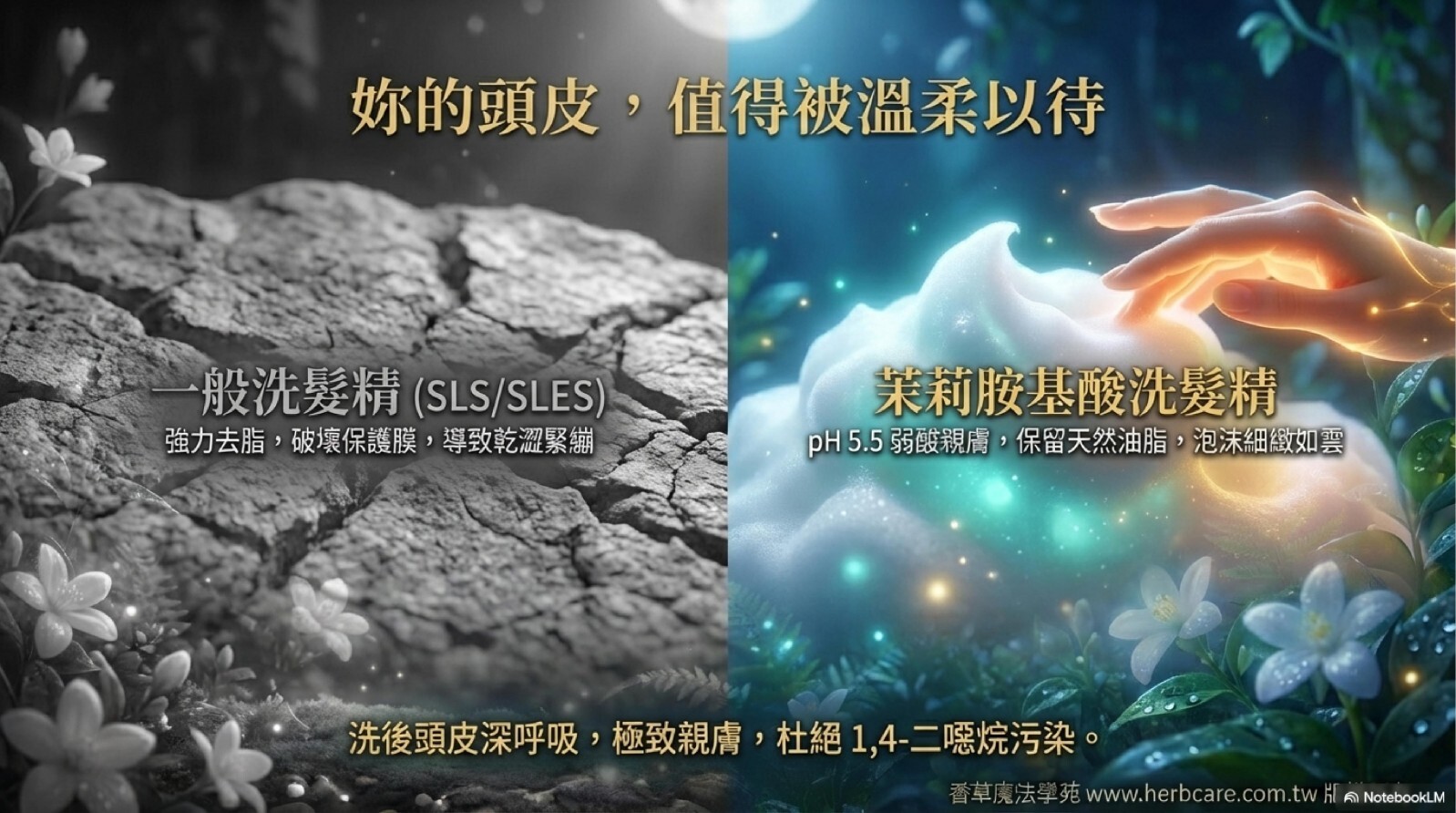 傳統洗髮精中的 SLS/SLES 雖然具有強勁的去脂力,但可能導致頭皮過度清潔、乾燥緊繃。我們的胺基酸基底,能夠溫和親膚地去除污垢,同時: