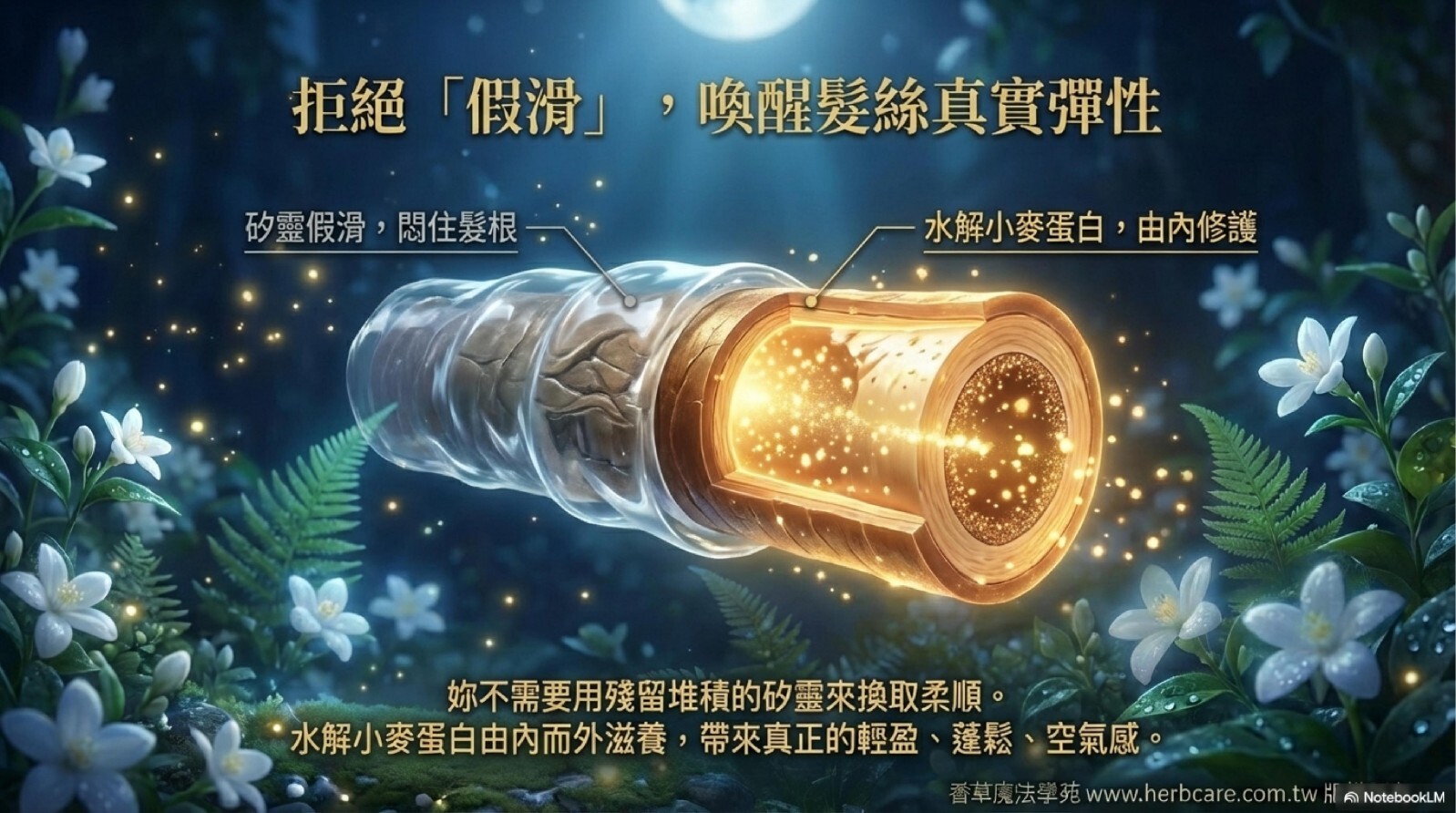 妳不需要用殘留堆積的矽靈來換取柔順感!矽靈會讓髮根悶油、影響代謝。我們的配方: