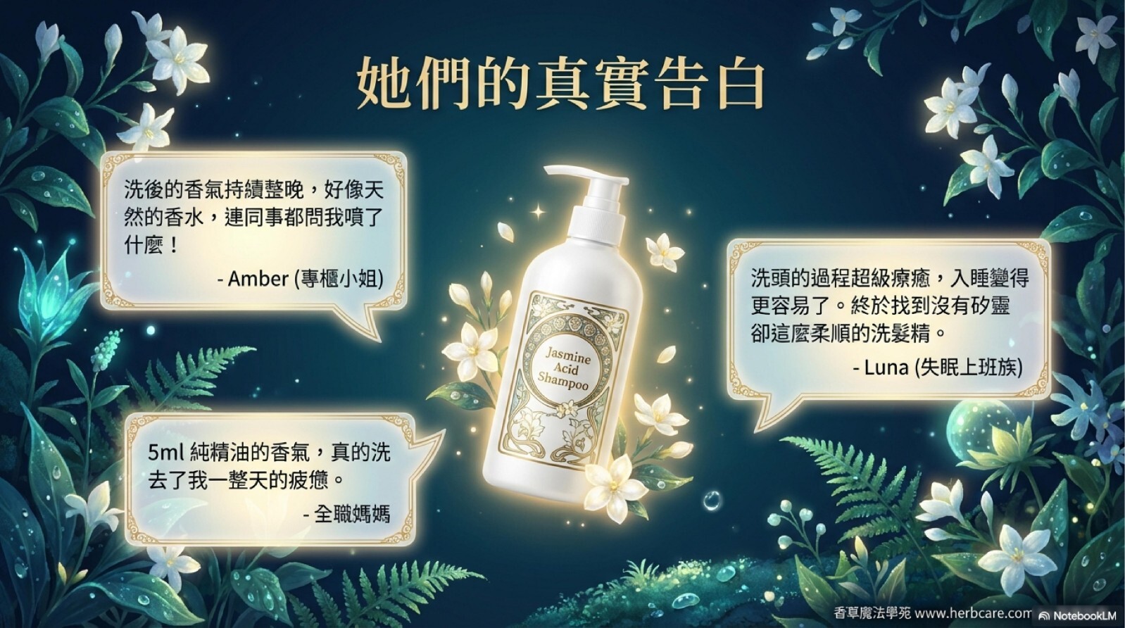 Luna, 28歲,失眠上班族:「我有輕微失眠問題,開始使用這款洗髮精後,發現入睡變得容易多了!茉莉香氣真的有放鬆效果,洗頭的過程超級療癒。頭髮也變好梳了。」