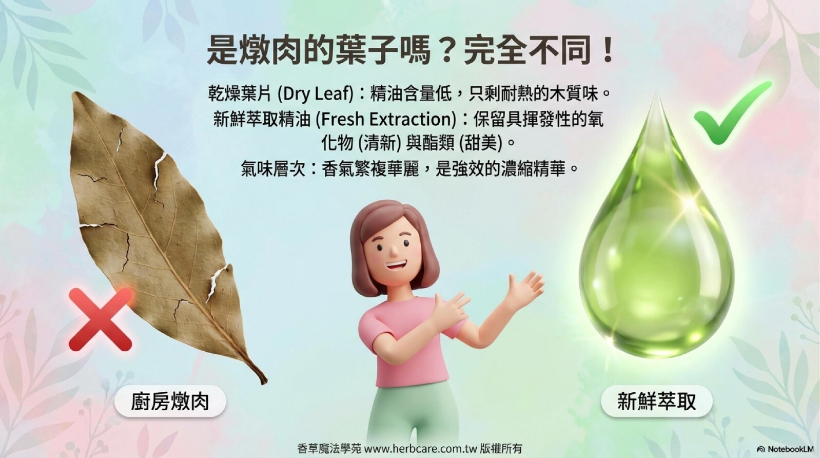 雖然來源相同,但廚房用的乾燥月桂葉,精油含量極低,主要剩下耐熱的木質味。而芳療級的月桂精油,是萃取自新鮮葉片,保留了具揮發性的氧化物(清新感)與酯類(甜美感),香氣層次豐富百倍,更是強效的濃縮精華。