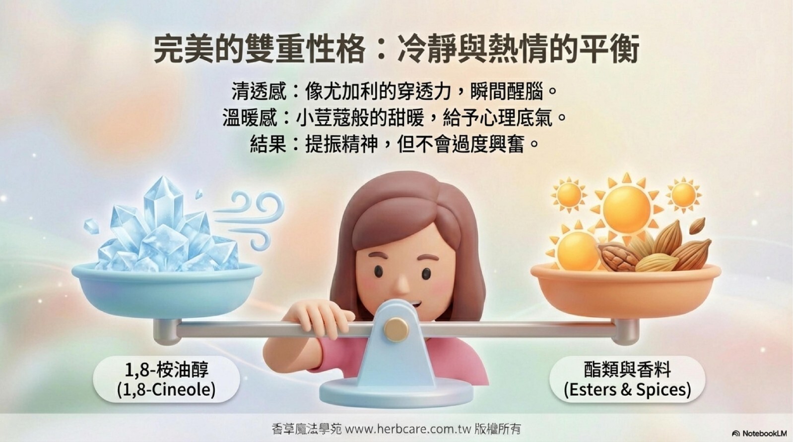 | 1,8-Cineole (1,8-桉油醇) | 35-50% | 帶來清新的穿透力,幫助專注。 |