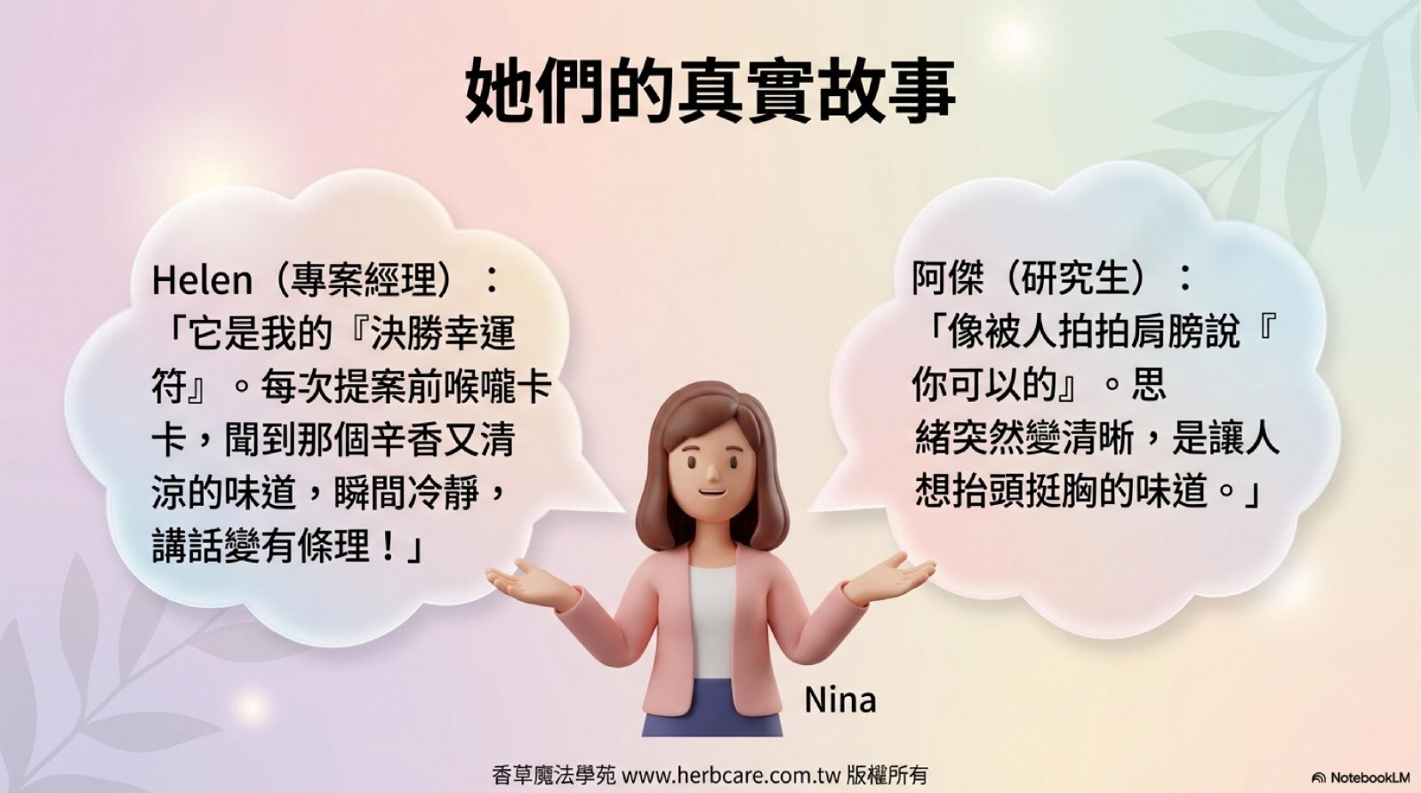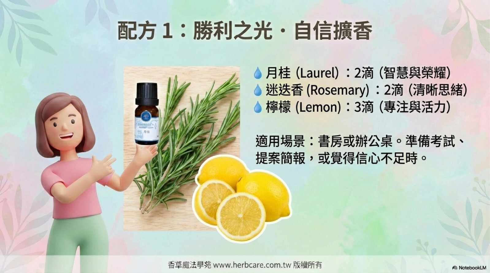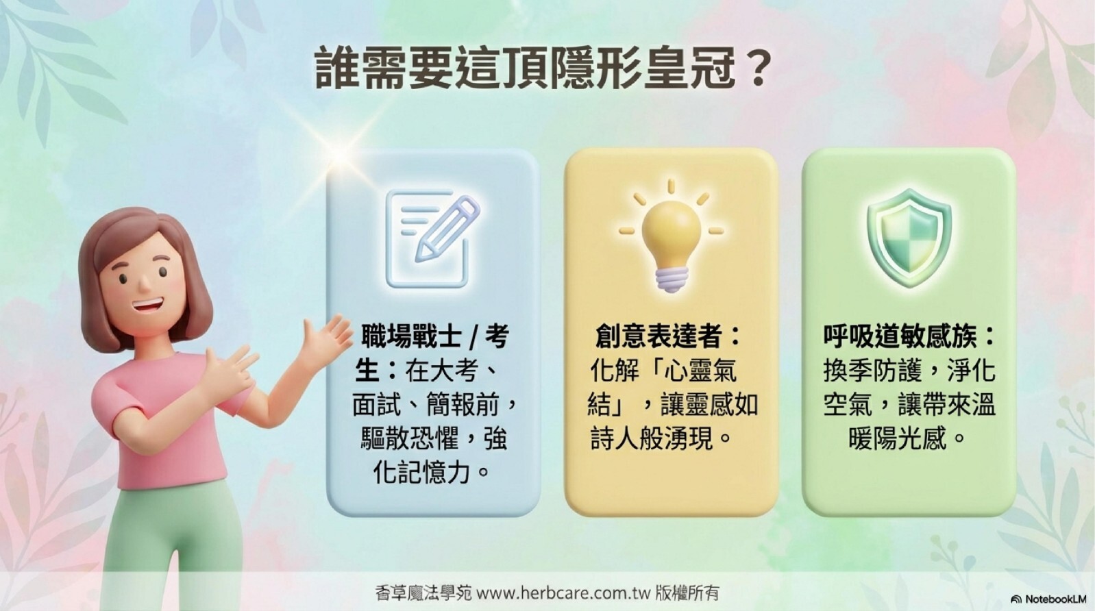 👉 用法: 在書房或辦公桌擴香。適合需要準備考試、提案簡報,或覺得自己信心不足時。