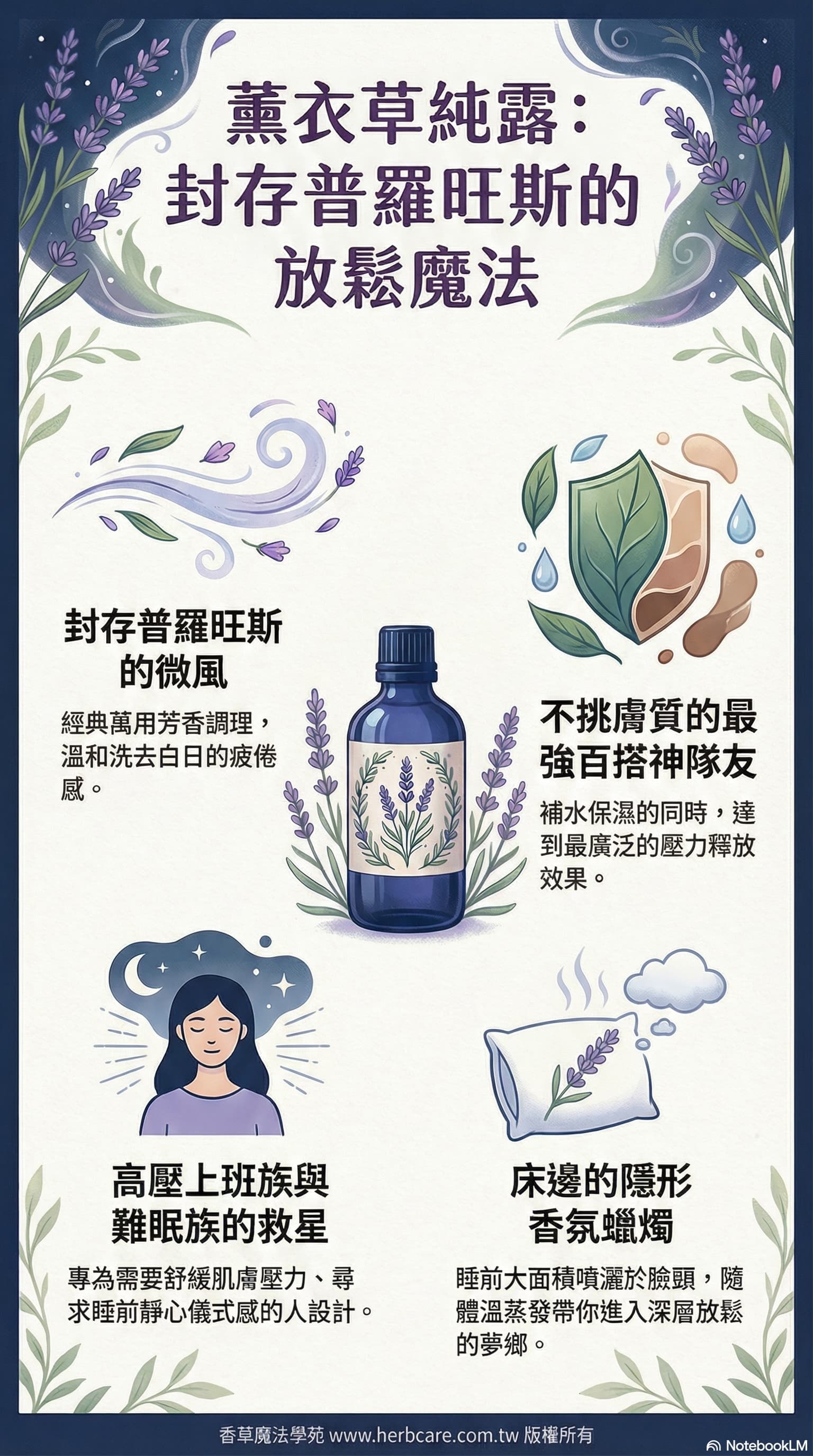 睡前舒緩噴:薰衣草純露 50ml+快樂鼠尾草精油 1滴+乳香精油 1滴,睡前噴臉部、胸口