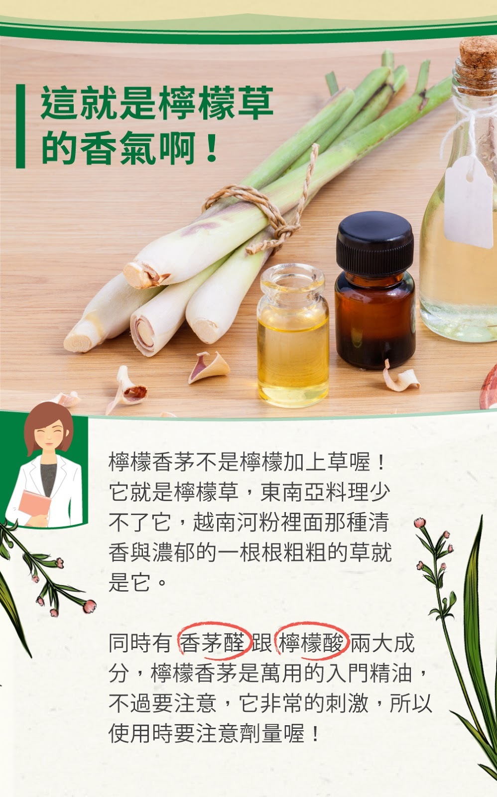 | A1: 檸檬香茅精油的檸檬醛成分,對蚊蟲具有一定的忌避效果,因此常被用於製作天然防蟲噴霧。 |