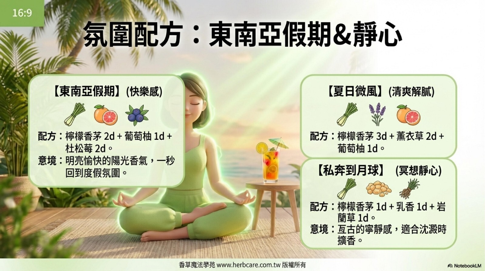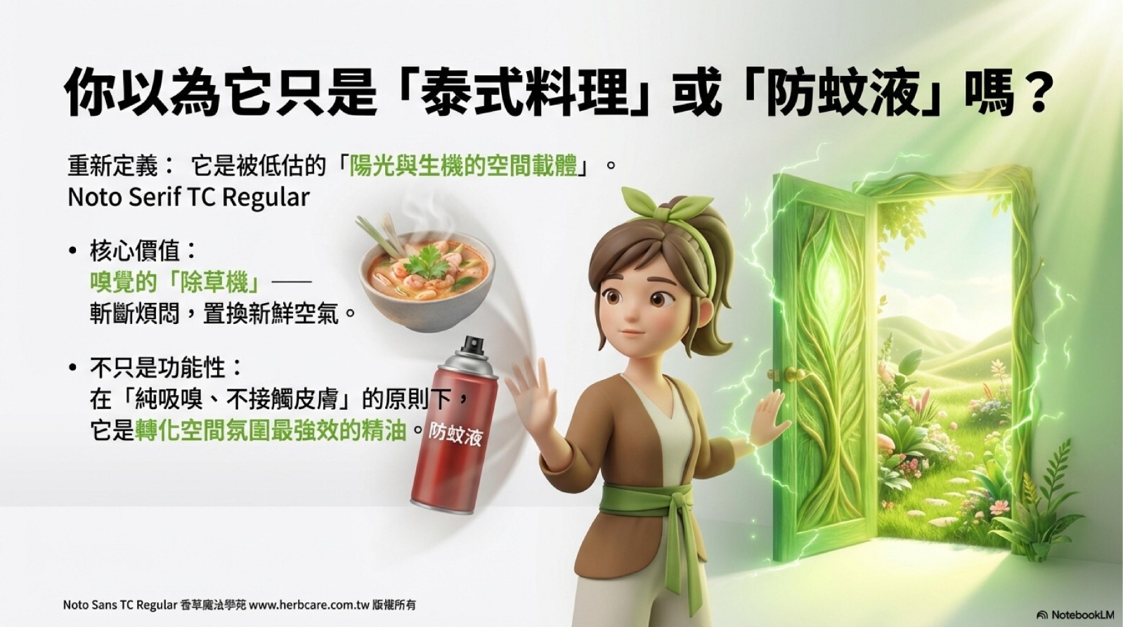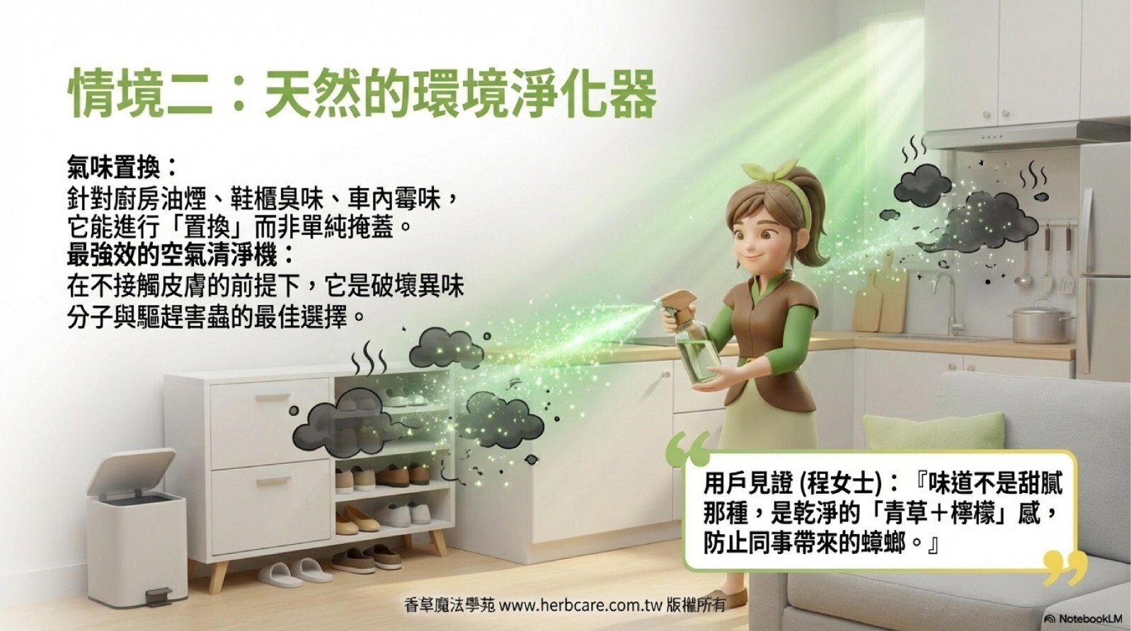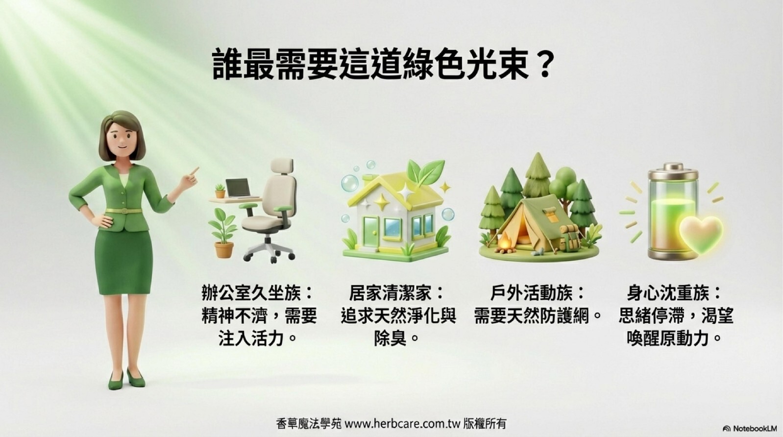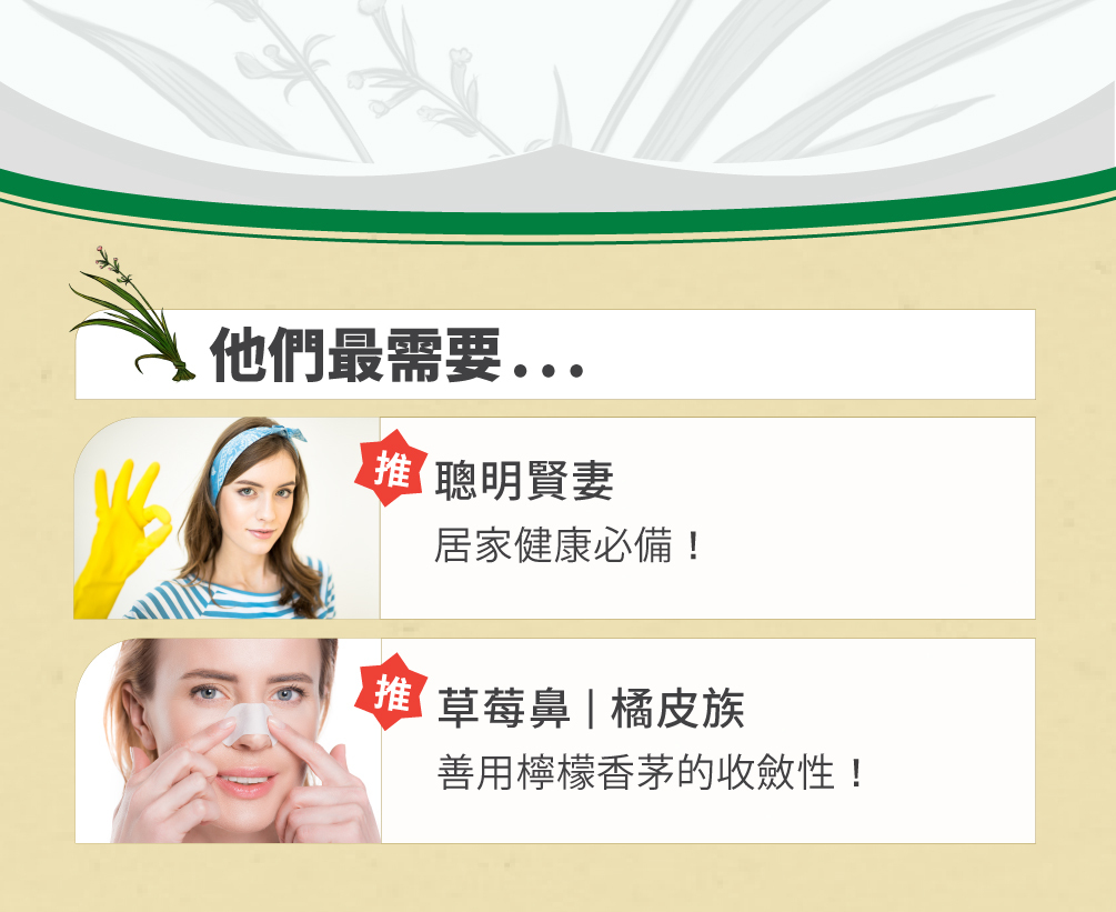 需求/時間點:當你感到精神不佳、需要集中精神時;或是想為居家環境除臭、驅蟲時。