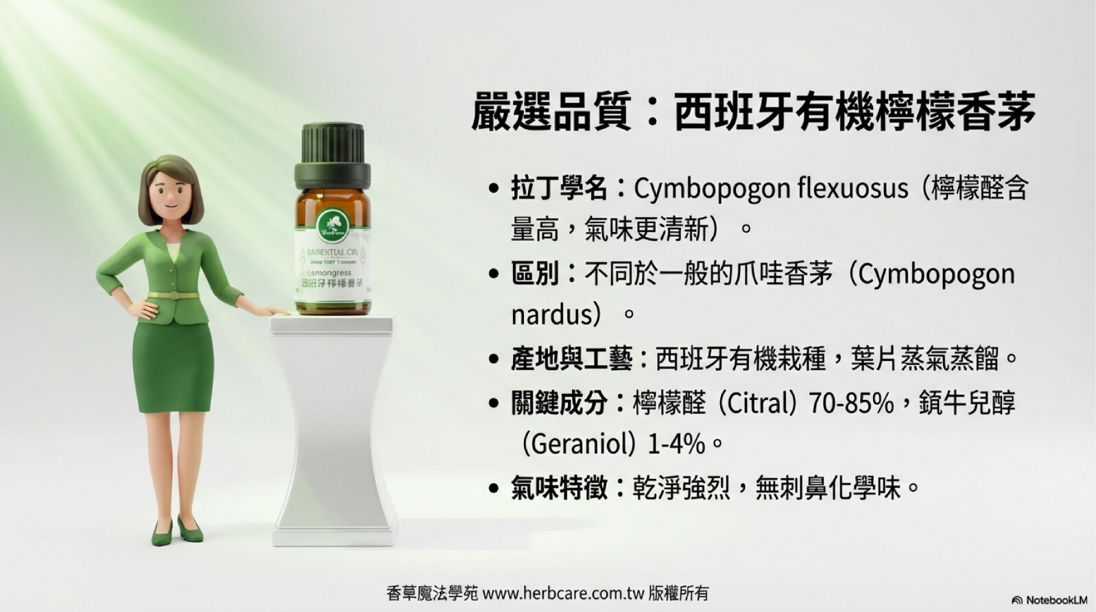 | 種類/品種差異 | 市面上常見的香茅精油有兩種:檸檬香茅 (Cymbopogon flexuosus) 和爪哇香茅 (Cymbopogon nardus)。此處介紹的檸檬香茅因其檸檬醛含量高,氣味更為清新,應用更廣。 |