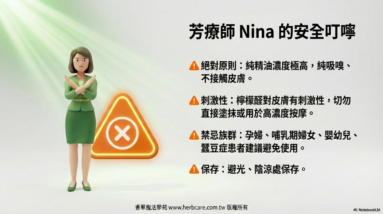 | A4: 孕婦使用任何精油前都應諮詢專業芳療師或醫師。由於檸檬香茅精油的成分較為強烈,建議孕婦與哺乳期婦女應避免使用。 |