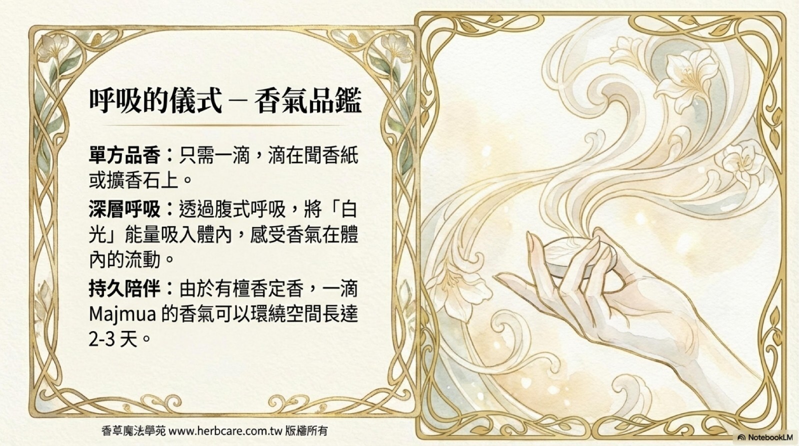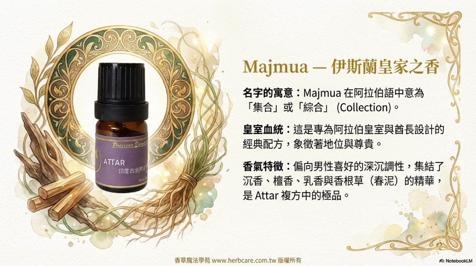Majmua" 是阿拉伯詞語,稱之為伊斯蘭皇家香,也可稱為阿拉伯香,因為它根源與伊斯蘭極深,最愛用的人是阿拉伯人,主要也只有貴族酋長才常用。Majmua是更偏向於男性偏好的香味,例如更多的木系香,如沉香、檀香、乳香,還有如春泥、香根草這類。