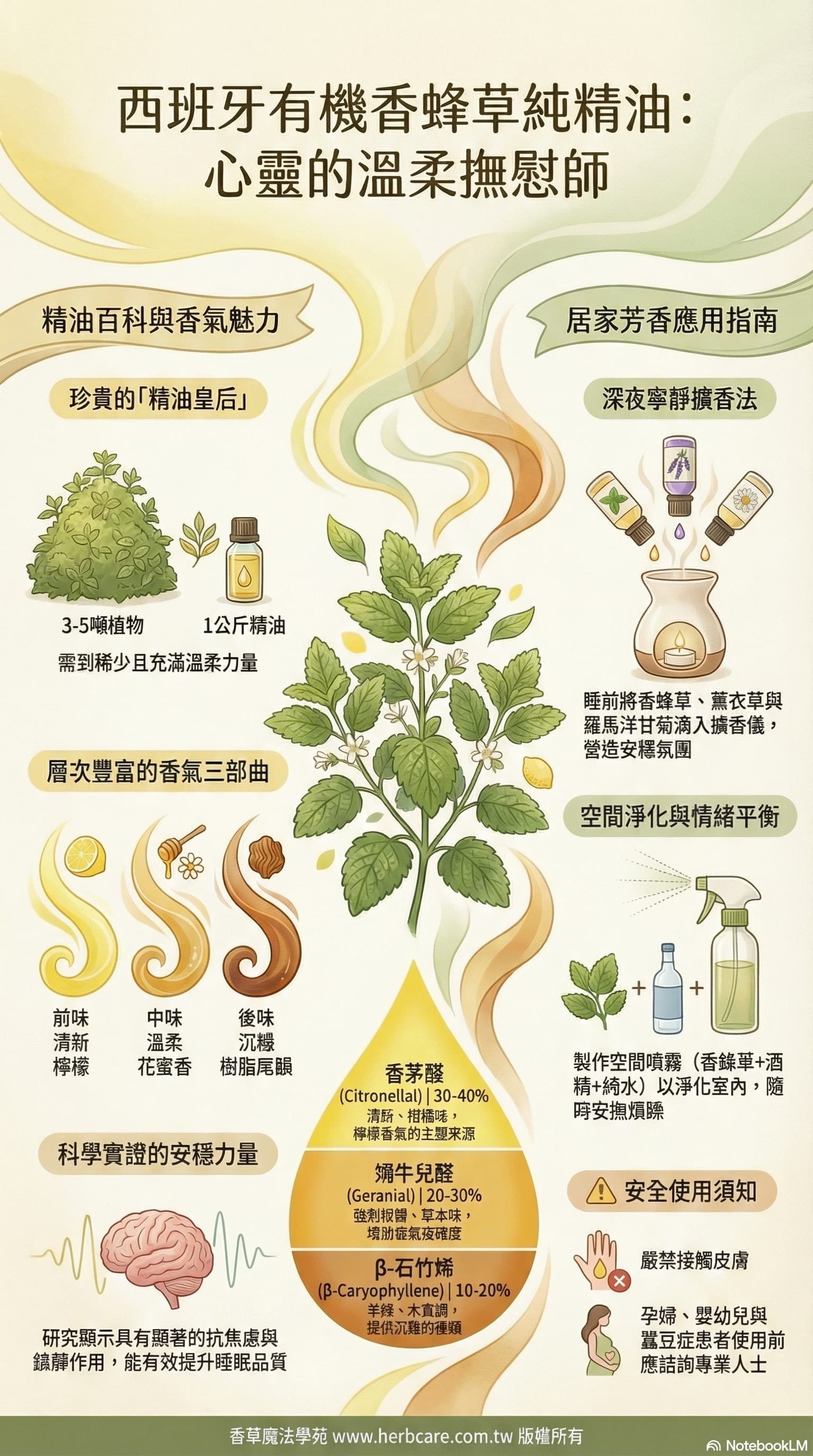 當生活中的焦慮、緊張像蜜蜂般在你心頭嗡嗡作響,你是否渴望一款能帶來平靜、安穩的香氣?香蜂草精油,正是你的心靈撫慰師。它溫柔而清新的香氣,能幫助你安撫心緒,找回內在的寧靜與和諧。自古希臘時期,香蜂草就被視為歡樂與長壽的象徵,其帶著清香檸檬與如蜂蜜般的甜香,故有「蜜蜂草」之名。如今,一瓶高品質的香蜂草精油,能讓你將這份古老的溫柔力量帶入現代生活。無論是想為情緒低落時給自己一個擁抱,或是想在失眠時尋求安穩,香蜂草精油都能成為你的心靈港灣。