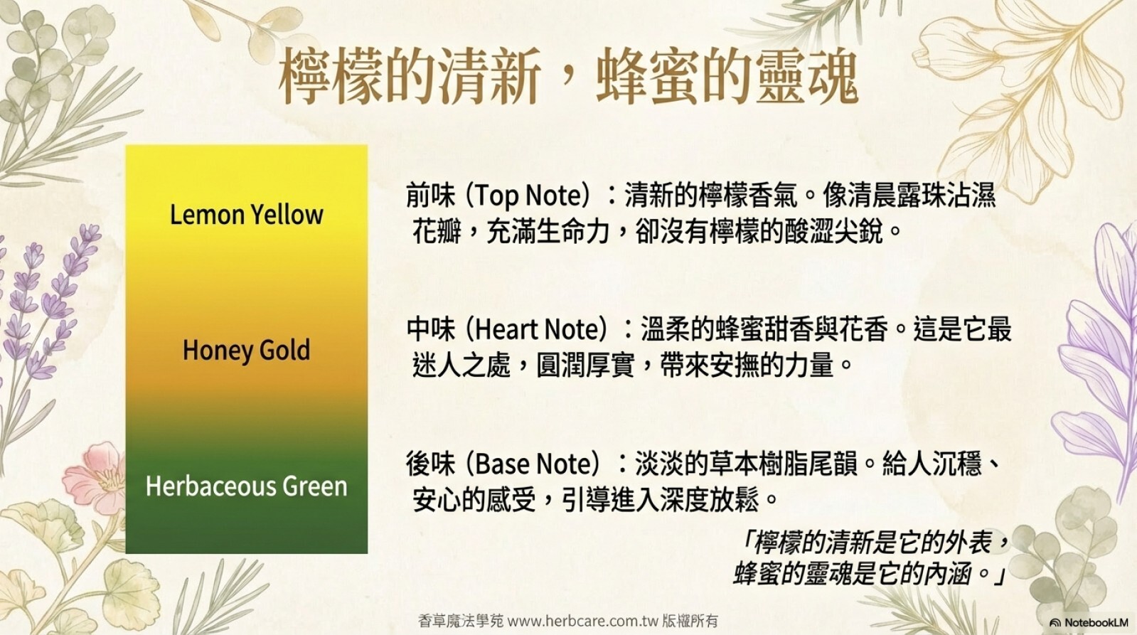 | A4: 香蜂草精油的主要成分是香茅醛與牻牛兒醛,這兩種分子都帶有強烈的檸檬香氣。因此,香蜂草精油聞起來會同時帶有檸檬的清新,以及草本花朵的溫柔,香氣複雜而迷人。 |