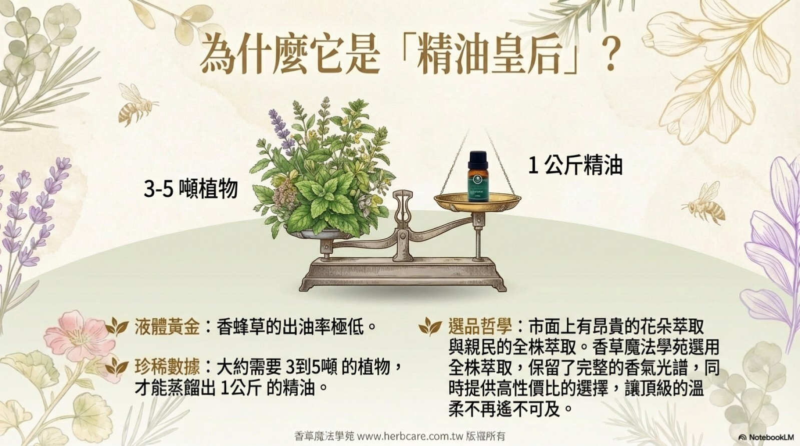 | A2: 香蜂草精油的提煉出油率極低,大約需要3到5噸的植物才能蒸餾出1公斤的精油,且其採集過程繁瑣。這使得它成為芳療界最珍貴、價格最高的精油之一,因此也被譽為「精油中的皇后」。 |