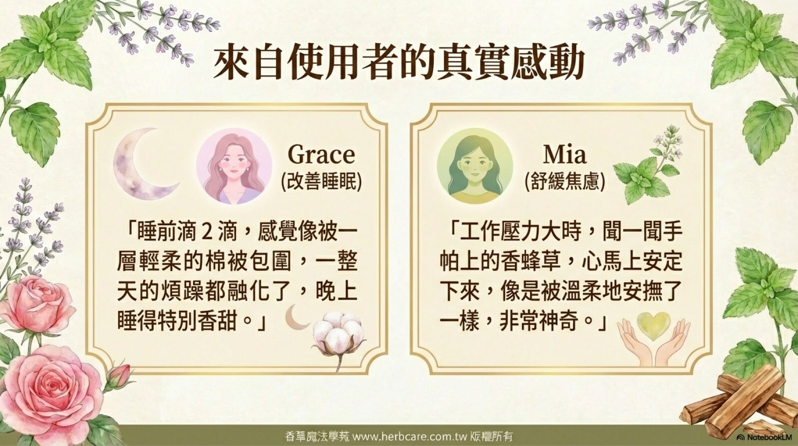 在這裡,我們分享一些用戶的真實體驗,讓您感受香蜂草精油在生活中的溫柔力量。