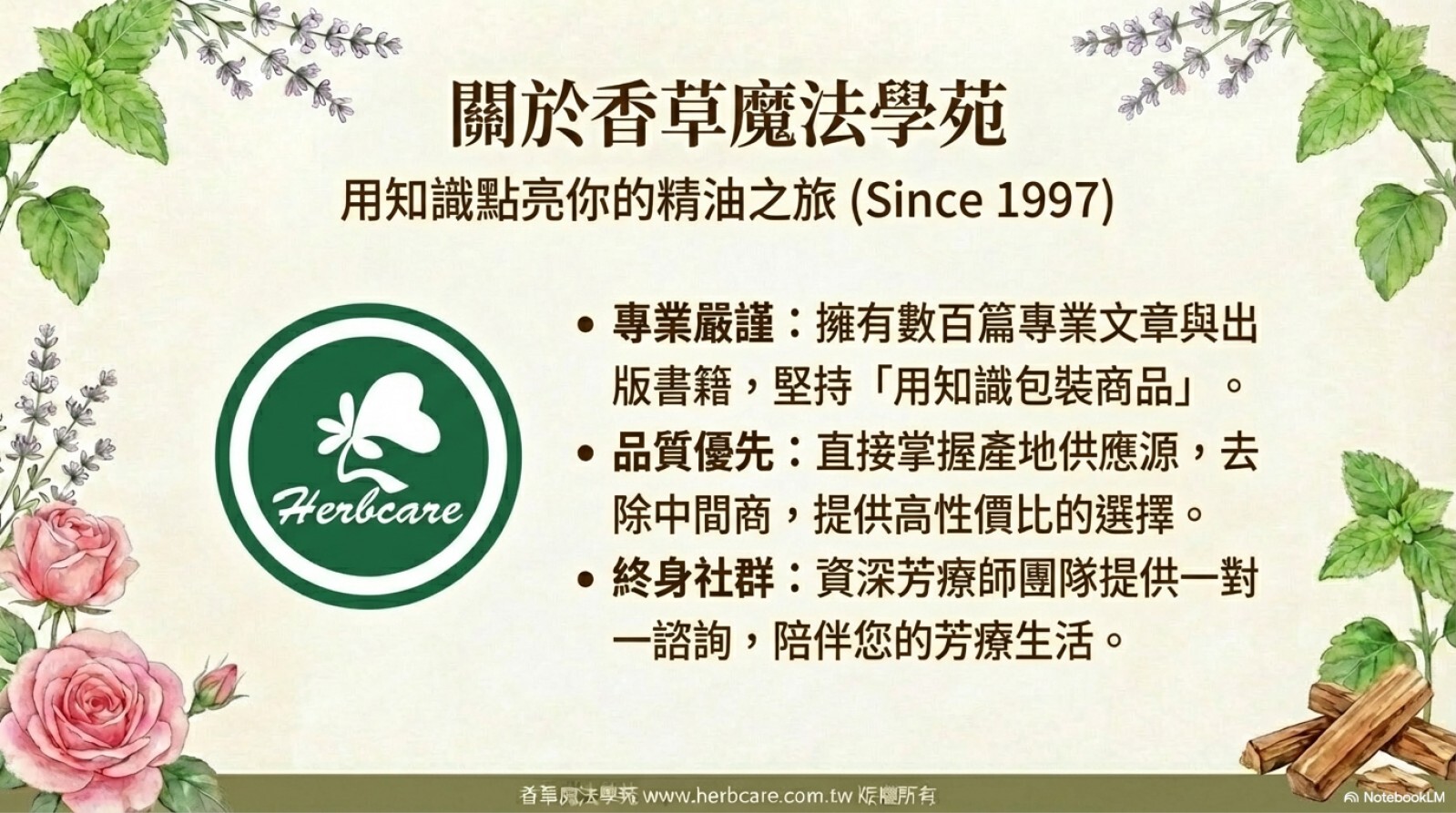 創立於20多年前,香草魔法學苑不只是個精油網站,更是由一群熱愛精油的同好共同打造的學習社群。我們相信,精油不只是商品,而是能優化身心靈的美好工具。因此,我們致力於「用知識包裝商品」,讓你先了解精油,再找到最適合你的選擇。