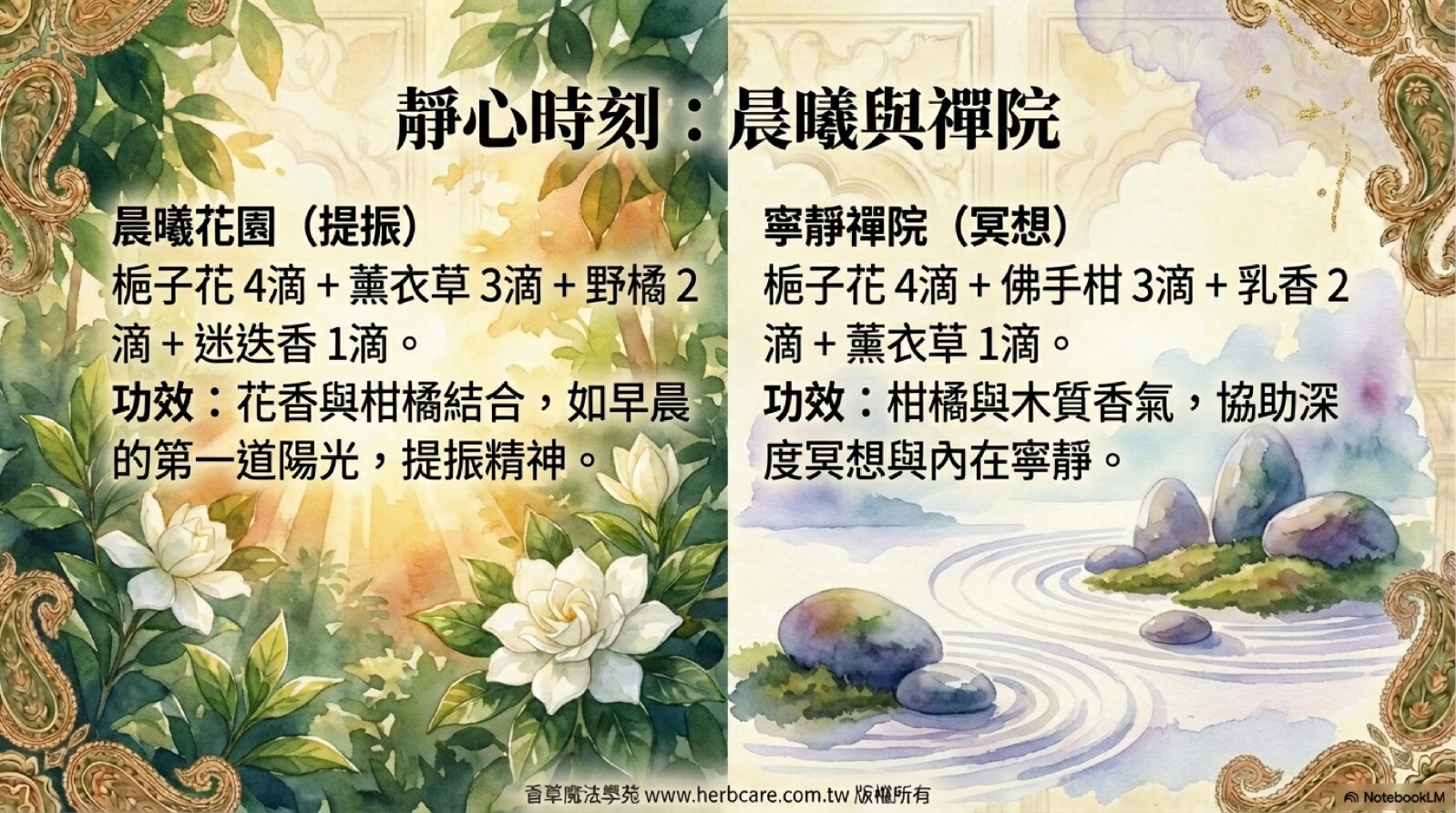 | 晨曦花園 | 梔子花Attar精油4d+薰衣草精油3d+野橘精油2d+迷迭香精油1d |