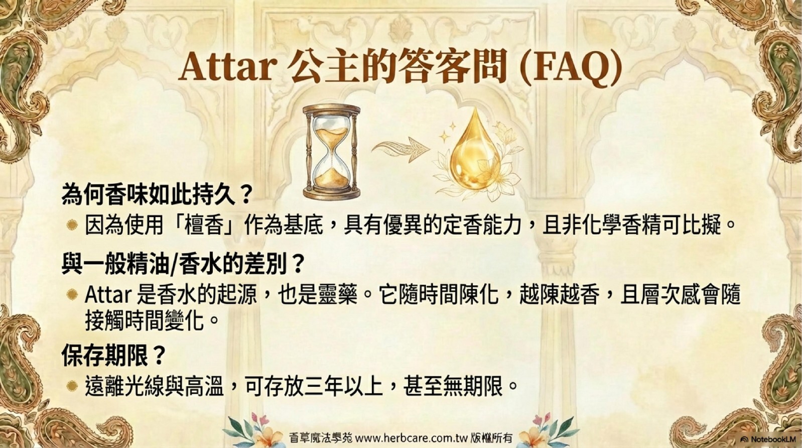 對原產地印度及主要使用市場伊斯蘭國家來說,香水也是一種藥,是針對身心靈各方面都有作用的,所以一開始我們就把香水與靈藥當作阿塔的定義。