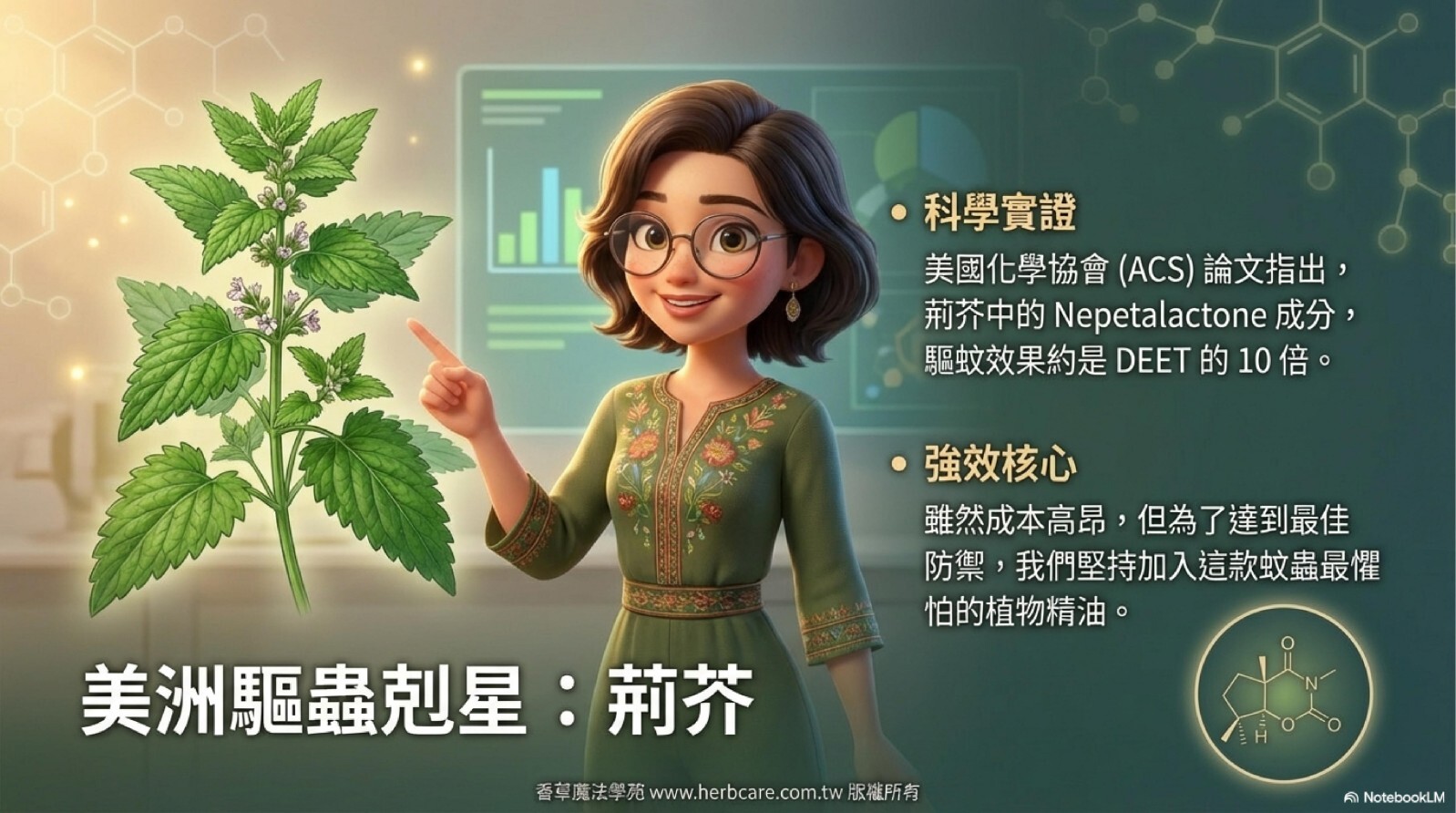 所謂「十倍」的說法,是經實驗證實,達到同樣的驅蚊效果,荊芥只需DEET十分之一的劑量,這個實驗對象是以美國常見的幾種蚊蟲,不過實驗主持人表示,荊芥中的 NEPETALACTONE 成分,正是目前已知重要的驅蚊成分,所以對全球各種品種的蚊蟲,都有相當的效果。