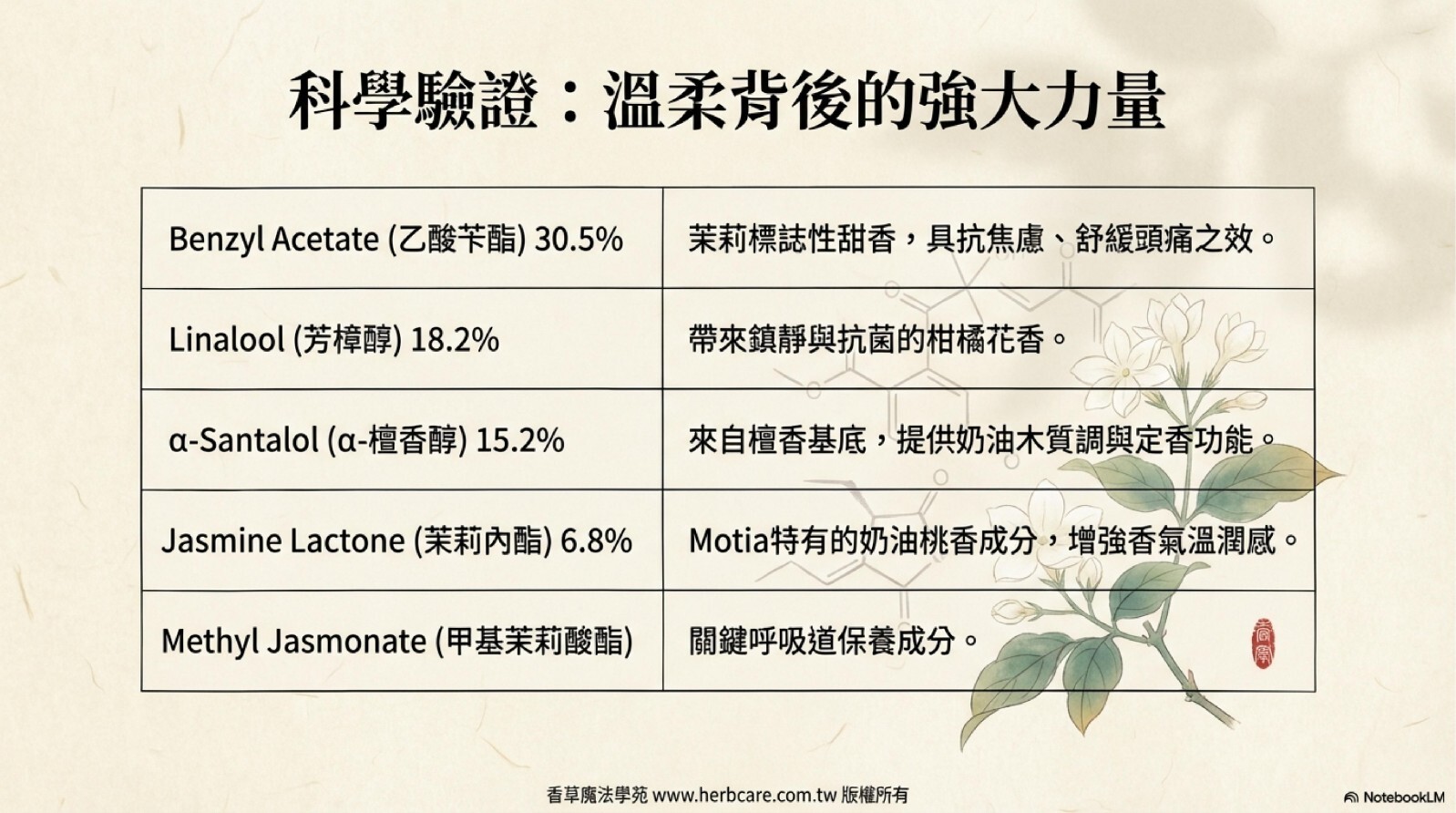 | 茉莉酮 | 10% | 甜美茉莉香 |