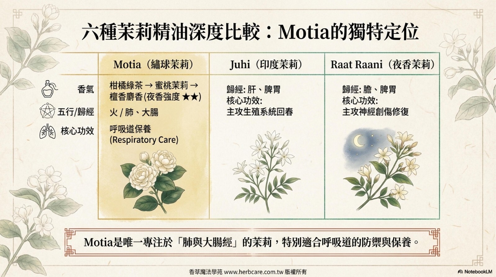 別名Belle of India是Jasminum sambac 的亞種,意謂「印度名媛」。香氣通常被描述為非常豐富和純淨,帶有明顯的甜美和花香。Motia Attar的香味帶有深邃和持久的特質。其特色之一是它的香氣隨時間逐漸展開,初始時可能是清新的花香,然後逐漸轉變為更為複雜和深沉的香調。因此在香氣 的個性上被定義為最有氣質的幽香。