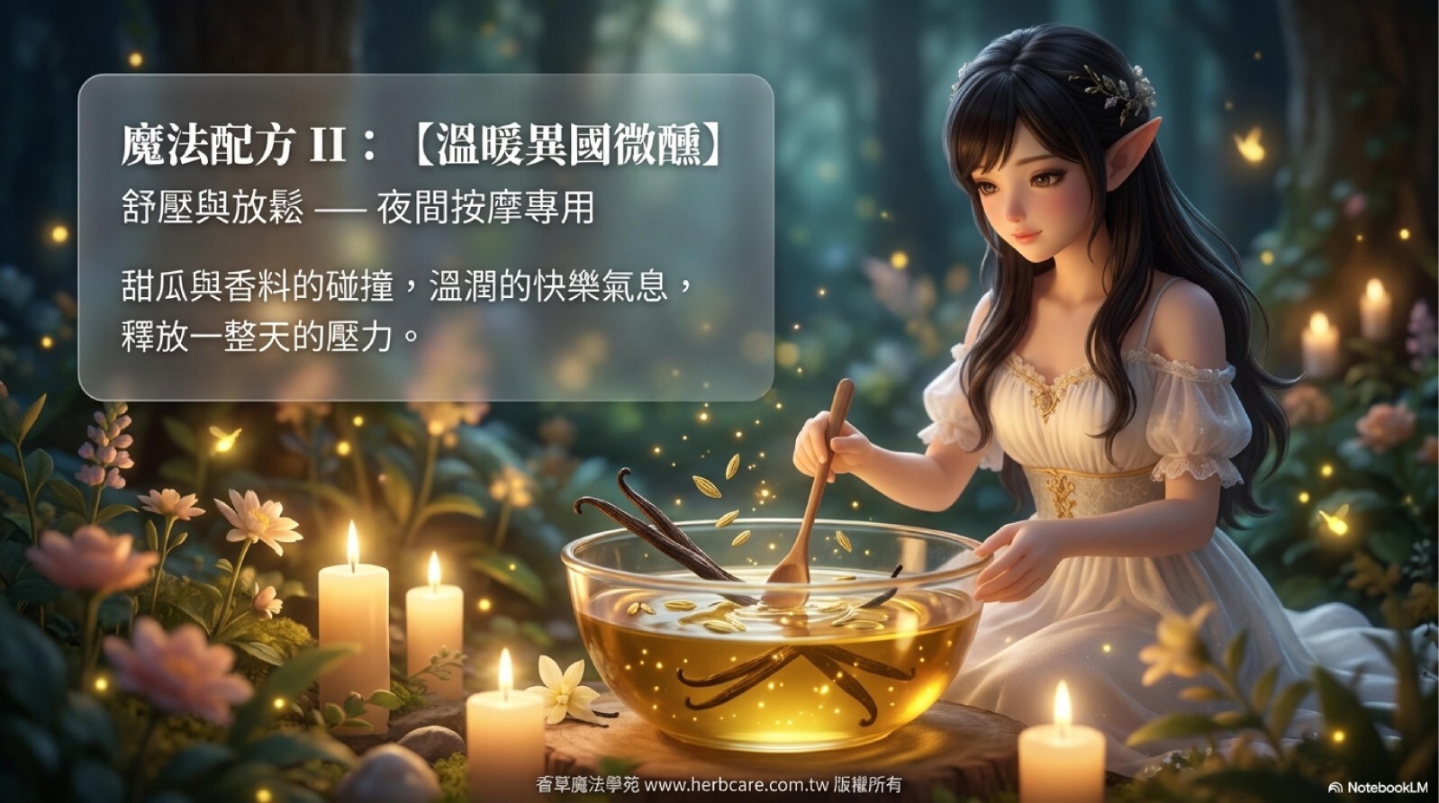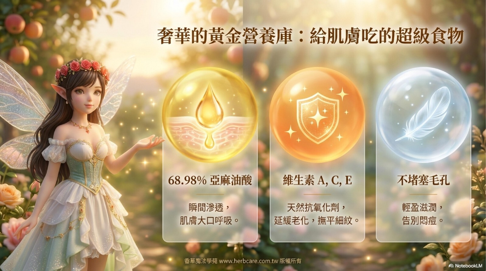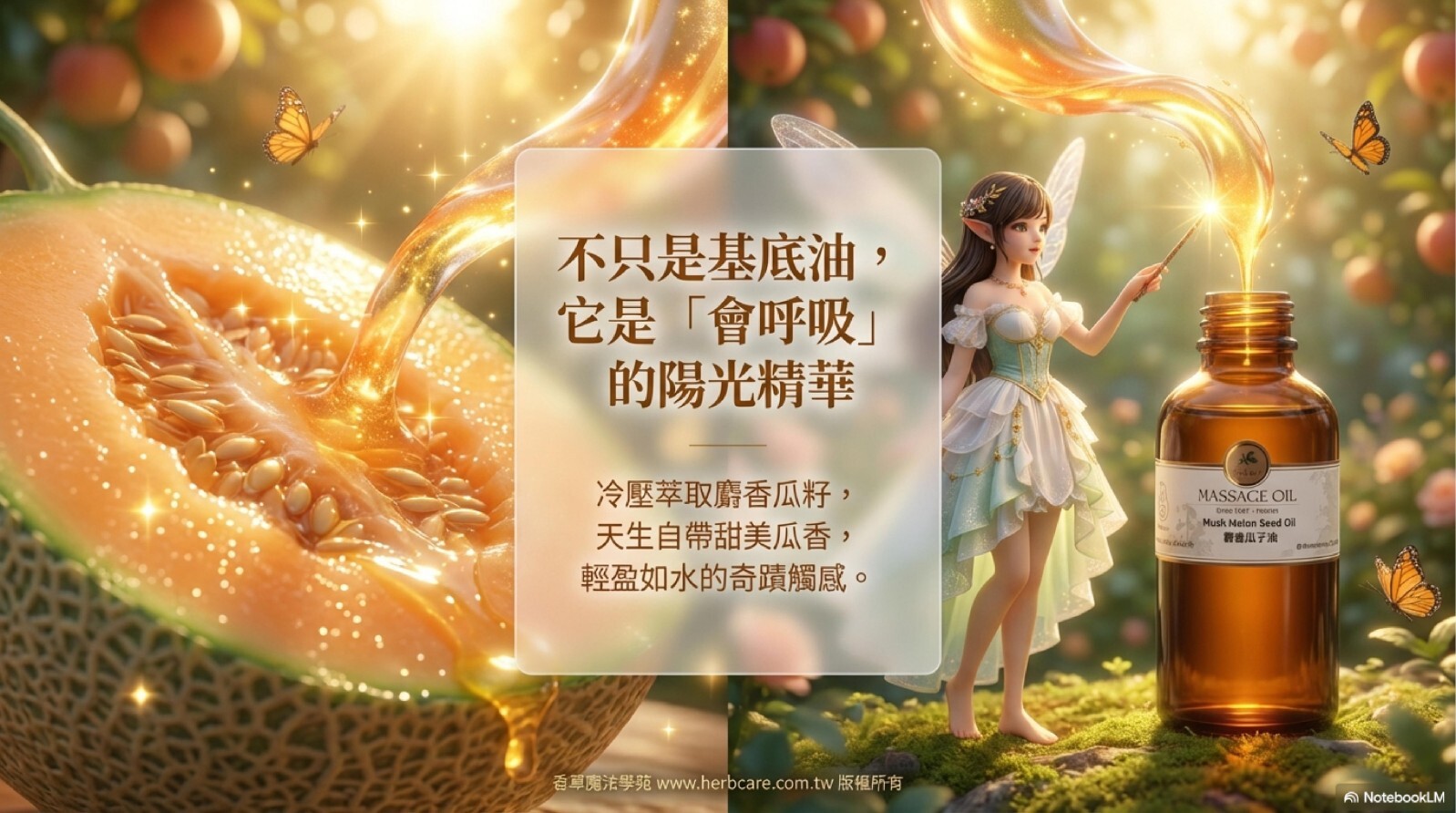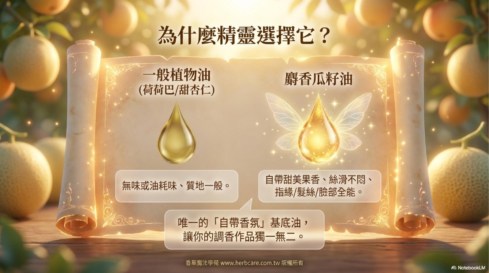麝香瓜子油的化學成分富含脂肪酸,包括亞麻油酸 (68.98%)、油酸 (15.84%) 和三亞麻油酸 (28.99%)及抗氧化劑,維生素 A、B6、C 和 E 而聞名。 這款基礎油具有輕盈、不油膩的稠度,可滋潤皮膚而不堵塞毛孔,調理頭髮而不壓垮頭髮。品質好的麝香瓜子油你會聞到自然舒適的甜瓜香味。所以它是有自然香味的基礎油。如果在調配時能善用這個特點,可以讓你的按摩油配方獨一無二。