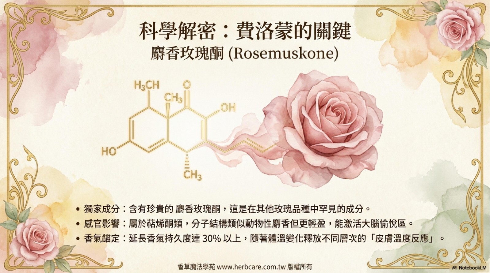 *麝香玫瑰酮屬於萜烯酮類(Terpenoid Ketones),是玫瑰香氣中「費洛蒙效應」的關鍵成分,其分子結構與動物性麝香相似但更輕盈。其他特性如: